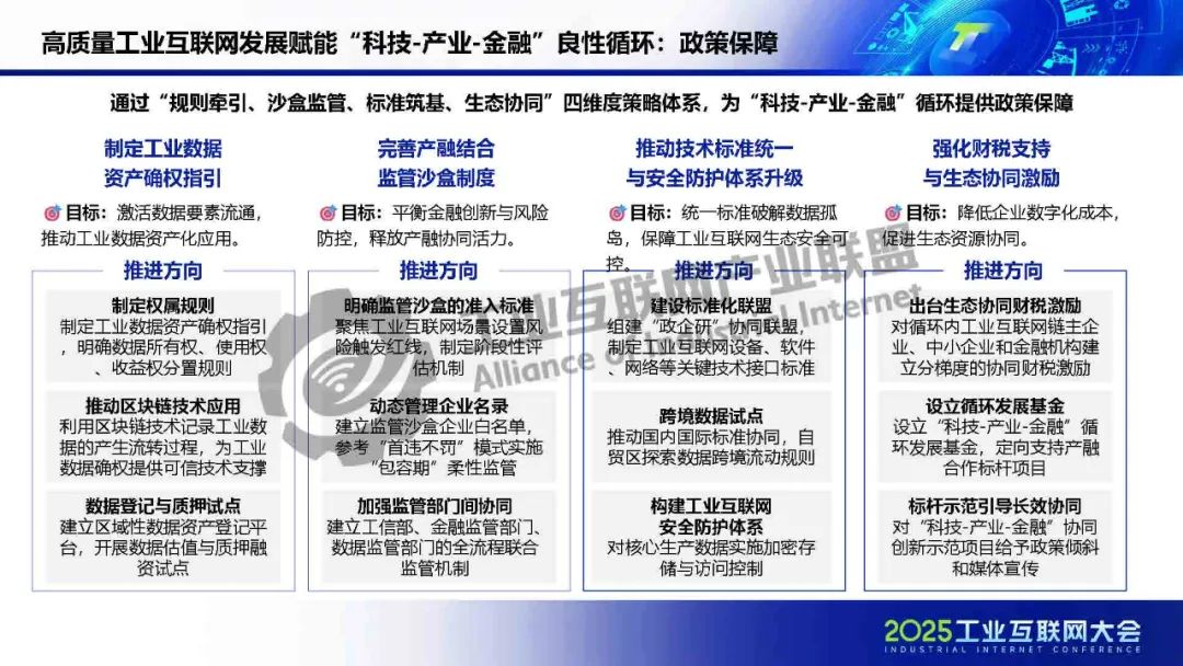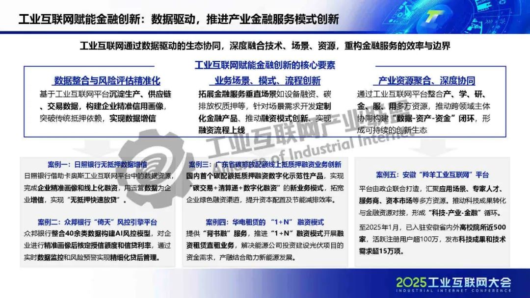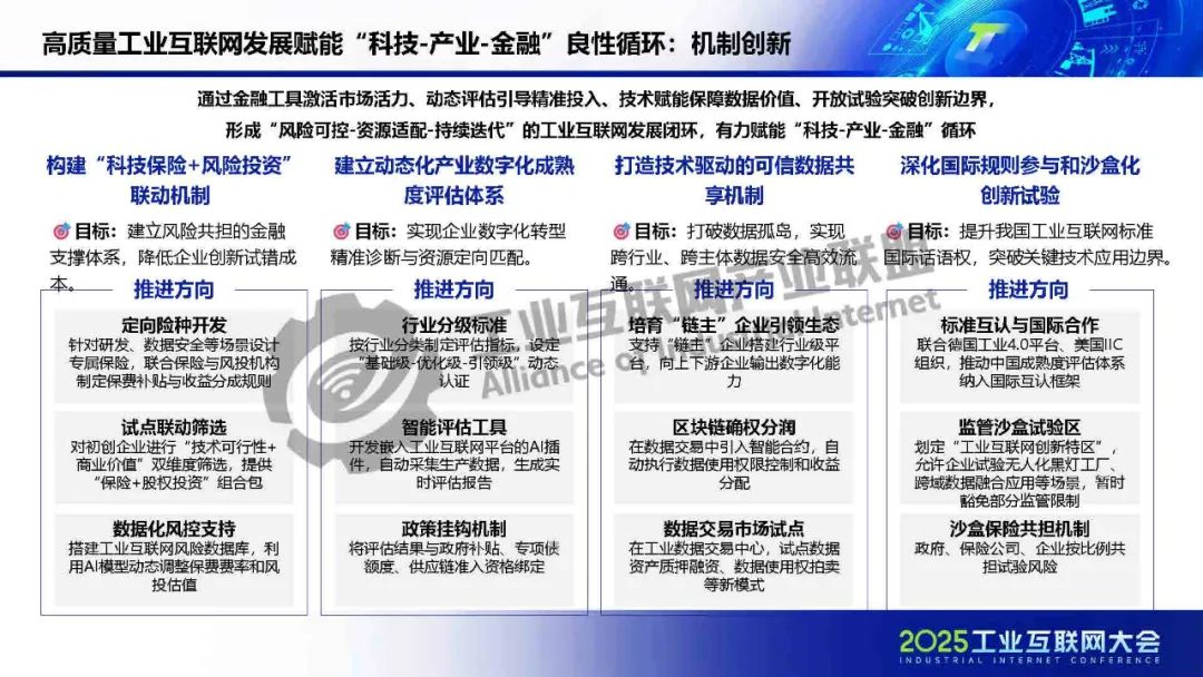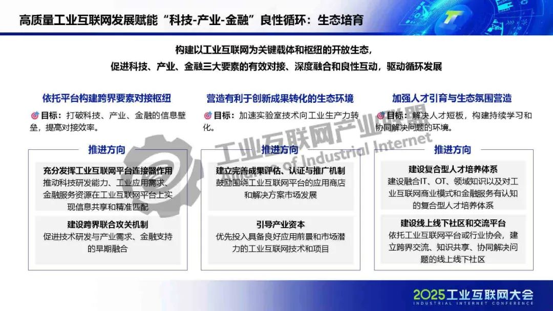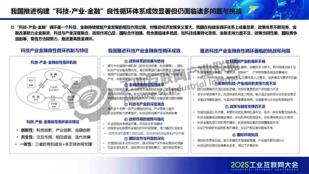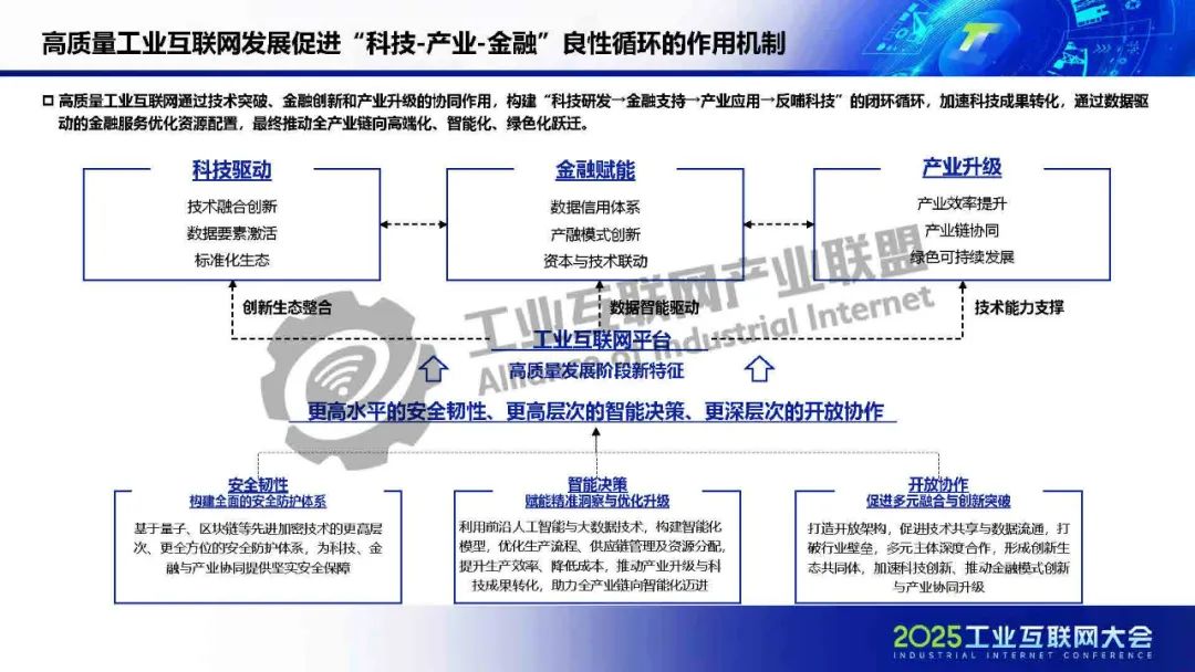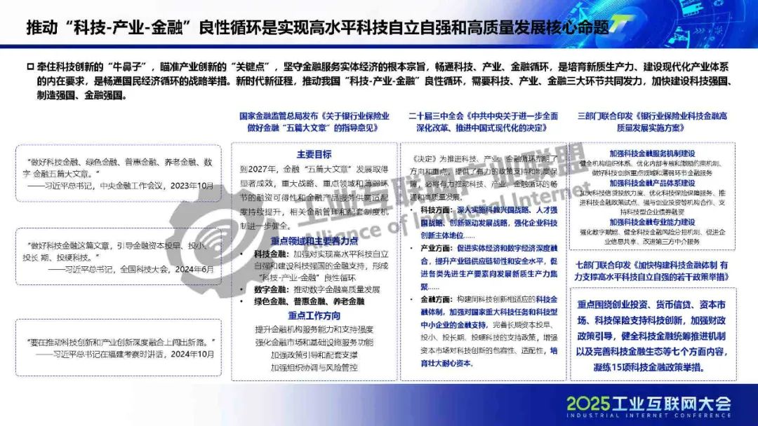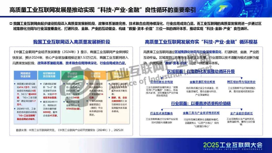 廖文凱介紹,我國工業(yè)互聯(lián)網(wǎng)由起步建設階段邁入高質(zhì)量發(fā)展新階段,政策體系漸趨完善、技術(shù)融合應用持續(xù)深化、行業(yè)應用成效凸顯。而工業(yè)互聯(lián)網(wǎng)的高質(zhì)量發(fā)展將進一步通過區(qū)域集群化協(xié)同與行業(yè)深度垂直化,打通科技、金融、產(chǎn)業(yè)的互動壁壘,構(gòu)建“數(shù)據(jù)-資本-價值”三位一體的循環(huán)體系,推動實現(xiàn)“科技-金融-產(chǎn)業(yè)”良性循環(huán)。