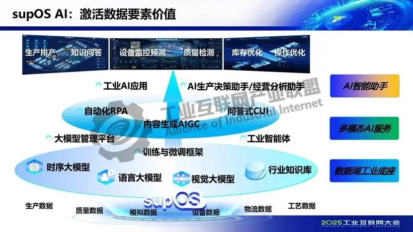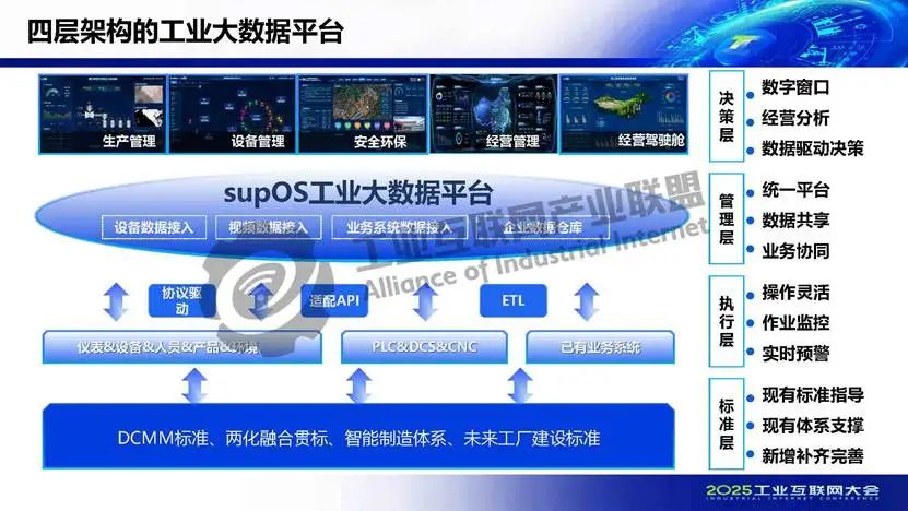 基于supOS的四層架構工業大數據平臺,旨在實現企業全鏈路數據整合與智能化管理。平臺通過設備數據、視頻數據和業務系統數據的多源接入,構建企業級數據倉庫,并依托協議驅動、API適配和ETL工具實現高效數據流轉。