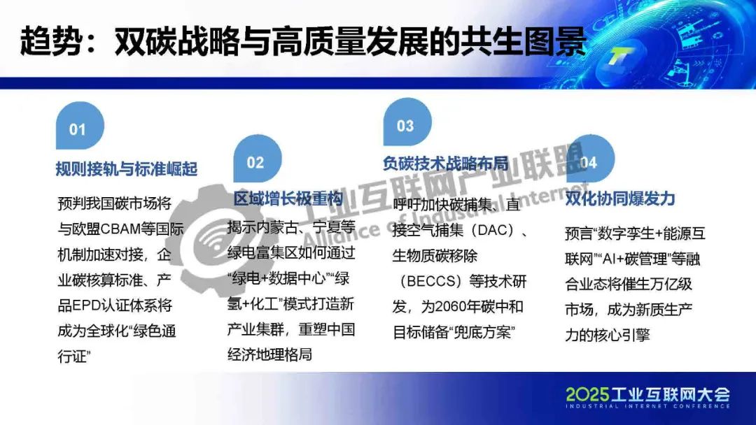 5月22日,在2025工業(yè)互聯(lián)網(wǎng)大會“工業(yè)數(shù)字化綠色化協(xié)同轉(zhuǎn)型專題活動”上,工業(yè)互聯(lián)網(wǎng)產(chǎn)業(yè)聯(lián)盟碳達峰碳中和工作組主席、中國信息通信研究院產(chǎn)業(yè)與規(guī)劃研究所總工程師高艷麗對《碳達峰碳中和藍皮書(2025)》進行了解讀。
