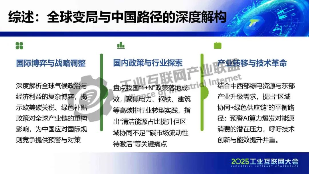 全球變局與中國路徑的深度解構(gòu):一是深度解析全球氣候政治與經(jīng)濟利益的復(fù)雜博弈,揭示歐美碳關(guān)稅、綠色補貼政策對全球產(chǎn)業(yè)鏈的重構(gòu)影響,為中國應(yīng)對國際規(guī)則競爭提供預(yù)警與對策;二是盤點我國“1+N”政策落地成效,聚焦電力、鋼鐵、建筑等高碳排行業(yè)轉(zhuǎn)型實踐,指出“清潔能源占比提升但區(qū)域協(xié)同不足”“碳市場流動性待激活”等關(guān)鍵痛點;三是結(jié)合中西部綠電資源與東部產(chǎn)業(yè)升級需求,提出“區(qū)域協(xié)同+綠色供應(yīng)鏈”的平衡路徑;預(yù)警AI算力爆發(fā)對能源消費的潛在壓力,呼吁技術(shù)創(chuàng)新與能效提升并重。