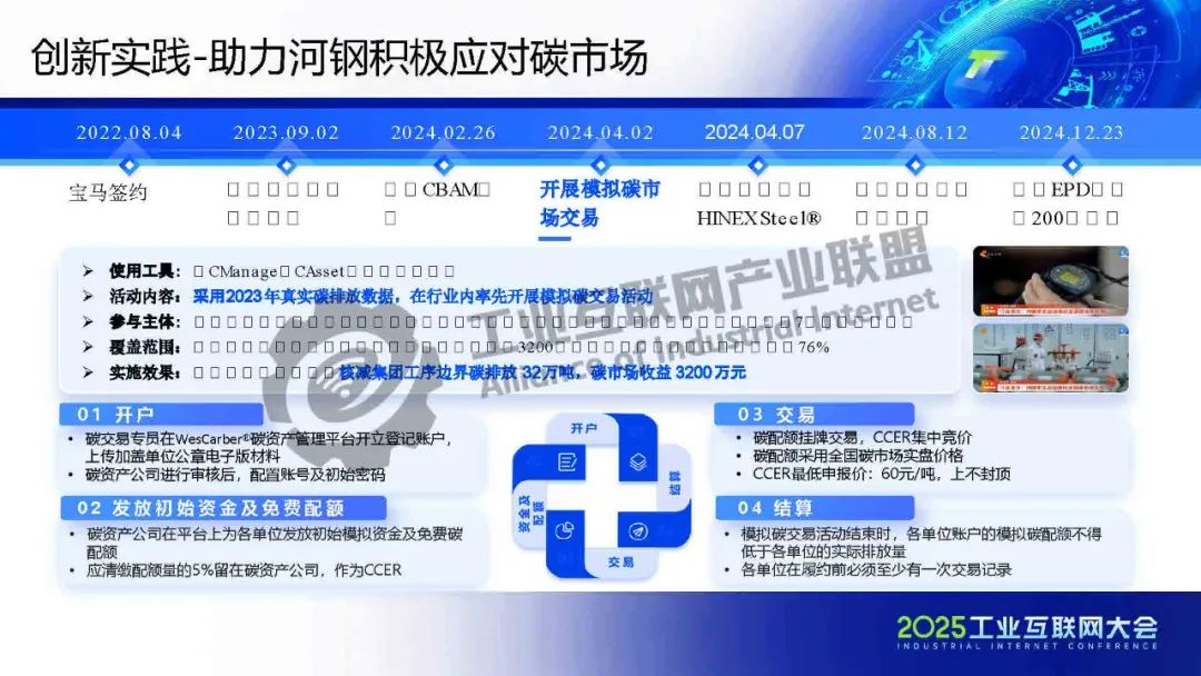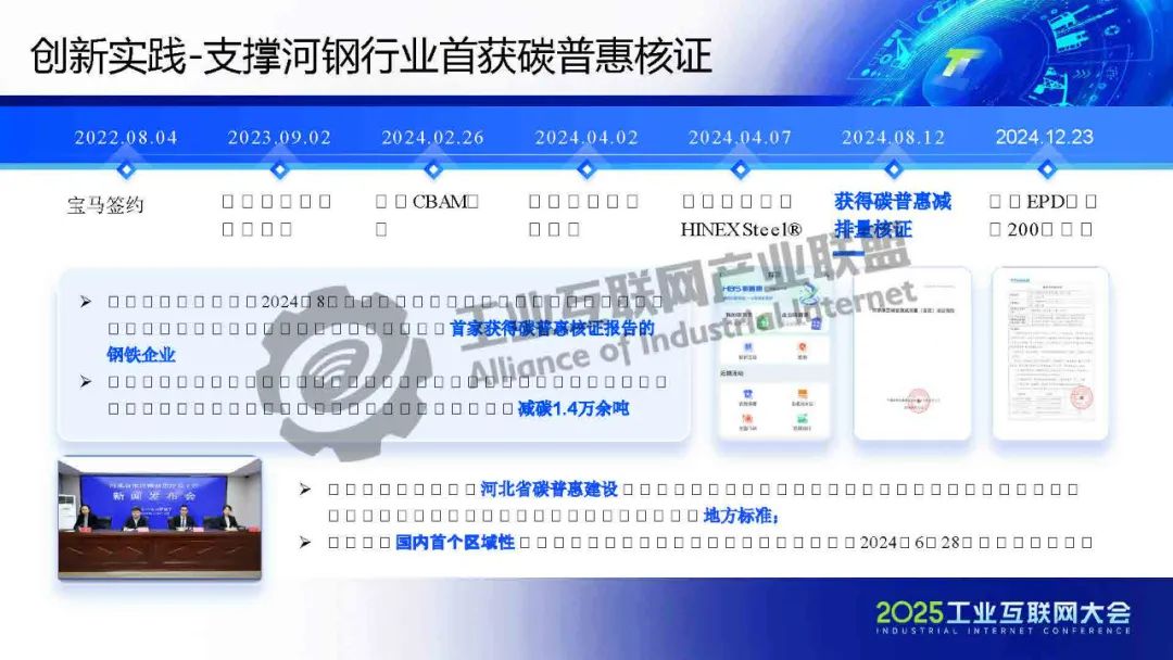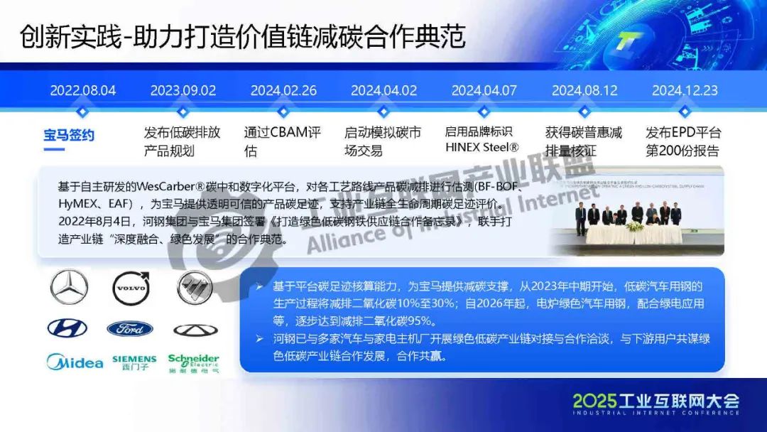 苗海濤介紹,河鋼數(shù)字作為河鋼集團數(shù)字化轉(zhuǎn)型的核心力量,聚焦綠色低碳數(shù)智化創(chuàng)新,通過自主研發(fā)的WesCarber碳中和數(shù)字化平臺及系列解決方案,助力集團實現(xiàn)全流程碳管理。平臺涵蓋碳足跡核算、碳資產(chǎn)管理、綠色供應鏈、CBAM應對等功能,并融合AI技術(shù)提升智能化水平。實踐案例包括:為寶馬提供透明碳足跡數(shù)據(jù)支撐合作簽約,助力集團獲得國內(nèi)首個CBAM符合性評估報告,推動低碳產(chǎn)品認證和碳普惠核證,完成60余項碳足跡服務及EPD報告發(fā)布。河鋼數(shù)字通過數(shù)據(jù)貫通與標準建設(shè),實現(xiàn)碳排放減少5%、管理效率提升40%,為鋼鐵行業(yè)綠色轉(zhuǎn)型提供示范。