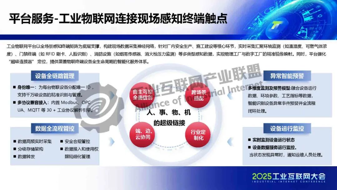 工業物聯網平臺以全場景感知終端矩陣為底層支撐,構建現場數據采集神經網絡,針對廠內安全生產、施工建設等核心環節,實時采集匯聚環境監測、門禁終端、消防設施等多類型感知數據,實現物理工廠與數字工廠的精準鏡像映射。同時,平臺強化 “超級連接器” 定位,提供覆蓋物聯終端設備全生命周期的智能化服務體系。