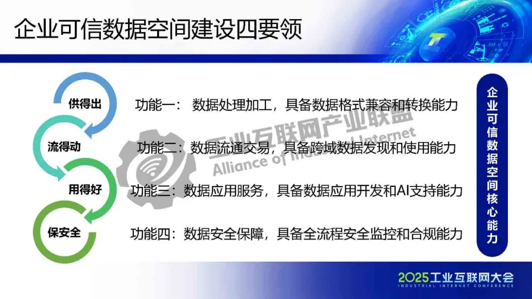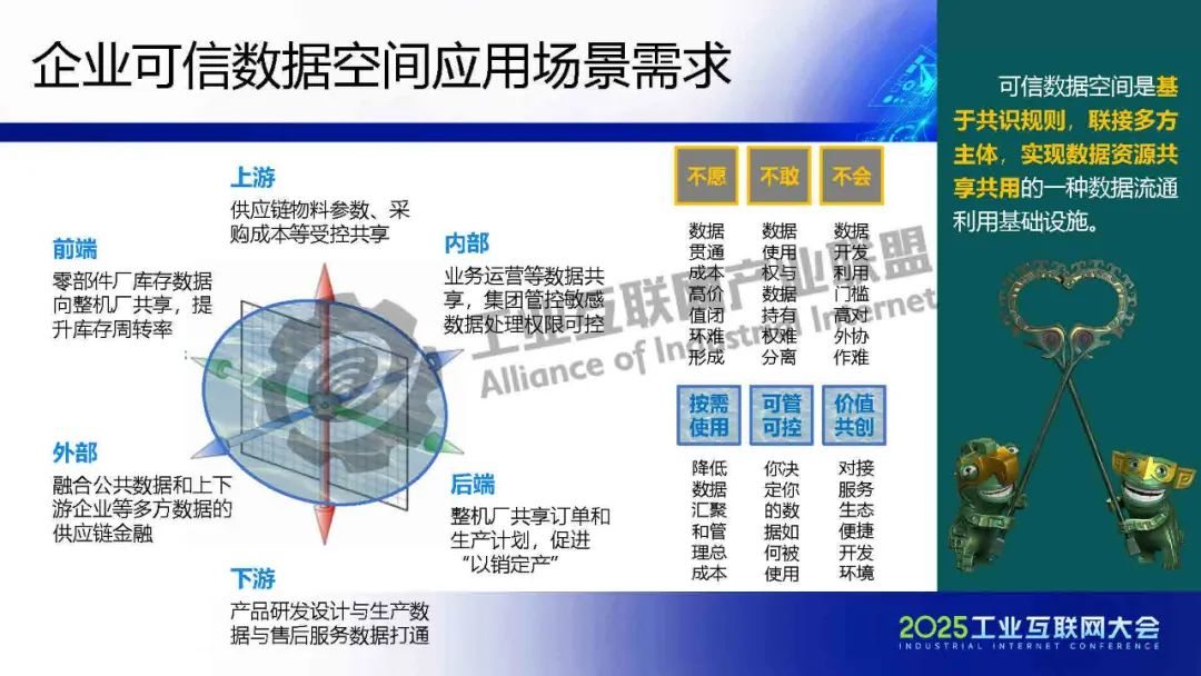 唐博介紹,智能制造企業(yè)通過建設(shè)可信數(shù)據(jù)空間,帶領(lǐng)產(chǎn)業(yè)鏈上下游共同接入數(shù)據(jù)流通,為“AI+”時(shí)代企業(yè)數(shù)據(jù)資源規(guī)模化開發(fā)利用,為促進(jìn)產(chǎn)業(yè)鏈供應(yīng)鏈協(xié)同提供了新思路和新模式。唐博提出制造企業(yè)數(shù)據(jù)資源的三大特征、企業(yè)可信數(shù)據(jù)空間建設(shè)的四項(xiàng)要領(lǐng)以及工業(yè)可信數(shù)據(jù)空間運(yùn)營的五個(gè)關(guān)注點(diǎn),分享了實(shí)體企業(yè)在可信數(shù)據(jù)空間建設(shè)和運(yùn)營方面的實(shí)踐經(jīng)驗(yàn),指出了可信數(shù)據(jù)空間系統(tǒng)解決方案的未來發(fā)展方向。