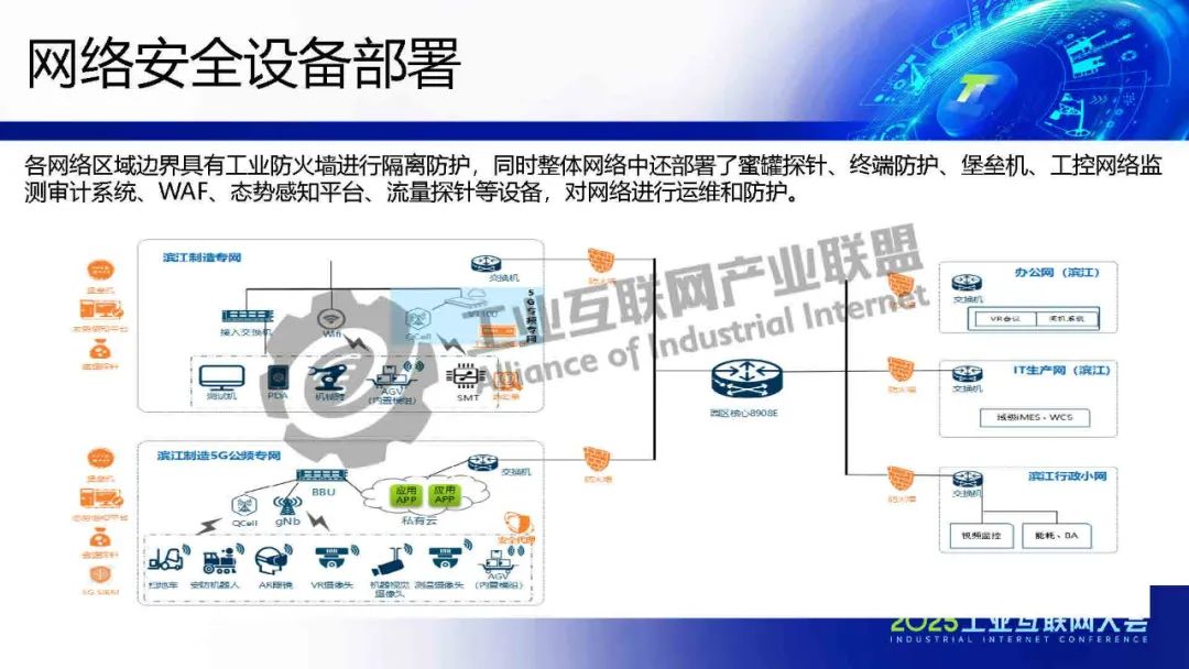郝振武介紹,中興通訊南京濱江智能制造基地是首個(gè)信通院認(rèn)證的五星5G工廠。基地整體網(wǎng)絡(luò)結(jié)構(gòu)劃分為辦公網(wǎng)、IT 生產(chǎn)網(wǎng)、濱江行政小網(wǎng)、濱江制造專網(wǎng)、濱江制造5G公頻專網(wǎng)等,其中制造專網(wǎng)中具有5G專頻專網(wǎng)用于現(xiàn)場(chǎng)生產(chǎn),非常具有典型意義。網(wǎng)絡(luò)遵循網(wǎng)絡(luò)安全等級(jí)保護(hù)的要求,按照“一個(gè)中心三重防護(hù)"設(shè)計(jì),在5G公頻專網(wǎng)部署了防火墻、堡壘機(jī)、態(tài)勢(shì)感知、蜜罐等防護(hù)措施,在5G專頻專網(wǎng)部署了工控防火墻、工控網(wǎng)絡(luò)監(jiān)測(cè)審計(jì)系統(tǒng),保證了網(wǎng)絡(luò)的安全運(yùn)行。基地通過了工業(yè)網(wǎng)絡(luò)與數(shù)據(jù)安全中心的工業(yè)互聯(lián)網(wǎng)企業(yè)網(wǎng)絡(luò)安全分類分級(jí)增強(qiáng)級(jí)評(píng)估,極大的提升網(wǎng)絡(luò)防護(hù)水平和安全治理效果。