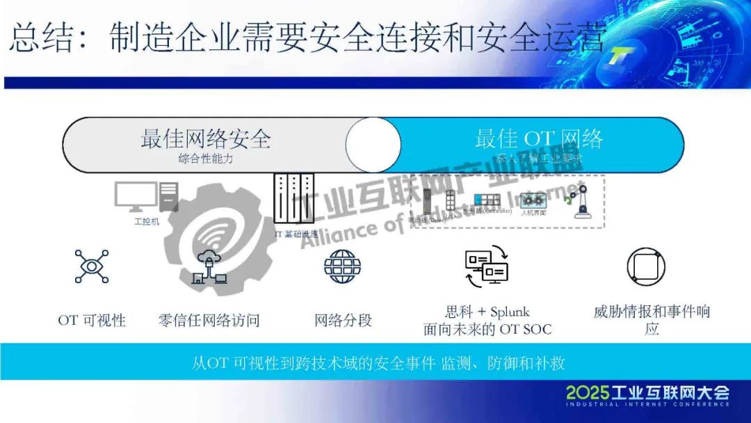 凌軍介紹,思科的工業安全解決方案旨在打通從工控現場感知到OT安全運營中心的完整安全鏈條,通過模擬化工廠PLC攻擊場景,生動展示了工業網絡脆弱性和工業安全的重要性。思科建議基于全技術棧和業界最佳實踐,實現OT資產的動態可視化、網絡分段和零信任訪問,并利用Cyber Vision和ISE認證平臺進行OT設備分類與風險評分,統一在Splunk SOC平臺形成統一工業安防儀表盤。制造企業需結合OT可視化、網絡分段和OT SOC能力,構建涵蓋威脅檢測到事件響應的綜合性安全體系,以應對未來工業網絡的安全挑戰。