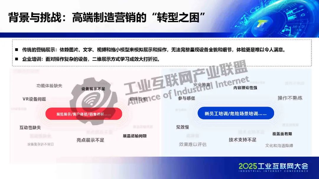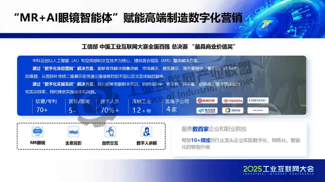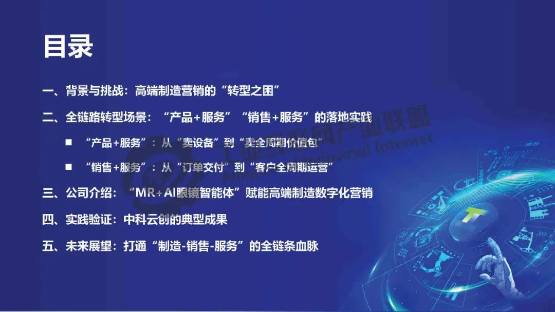 王哲介紹,中科云創(chuàng)針對(duì)高端制造營(yíng)銷(xiāo)轉(zhuǎn)型困境,提出"產(chǎn)品+服務(wù)"和"銷(xiāo)售+服務(wù)"全鏈路解決方案,推動(dòng)從單純賣(mài)設(shè)備向全周期價(jià)值服務(wù)升級(jí),通過(guò)"MR+AI眼鏡智能體"技術(shù)賦能,實(shí)現(xiàn)從訂單交付到客戶全周期運(yùn)營(yíng)的數(shù)字化營(yíng)銷(xiāo)轉(zhuǎn)型,典型實(shí)踐驗(yàn)證了其有效性,未來(lái)將致力于打通"制造-銷(xiāo)售-服務(wù)"全鏈條協(xié)同。