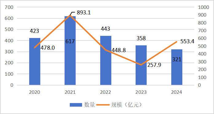 2020-2024年工業(yè)互聯(lián)網(wǎng)領(lǐng)域投融資事件數(shù)量與規(guī)模