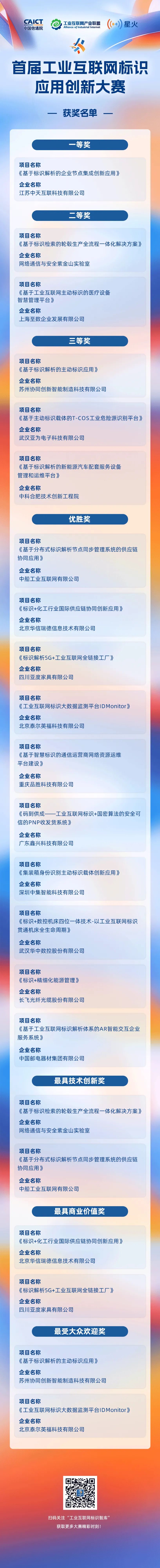 2023年12月13日,首屆工業互聯網標識應用創新大賽總決賽落下帷幕;14日,工業互聯網標識貫通創新發展大會暨首屆工業互聯網標識應用創新大賽總決賽頒獎儀式在重慶市舉辦。首屆工業互聯網標識應用創新大賽正式圓滿收官。