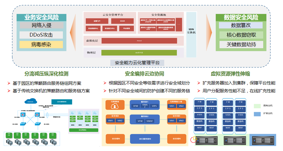 圍繞SDN、安全資源池、云安全管理平臺3大模塊,構(gòu)建云化網(wǎng)絡(luò)防護(hù)能力,安全能力部署在UPF近源側(cè),通過分流減壓縱深化檢、安全編排云邊協(xié)同、虛擬資源彈性伸縮多維度安全協(xié)同,為企業(yè)客戶打造專屬的安全解決方案,對企業(yè)網(wǎng)絡(luò)進(jìn)行全流量安全監(jiān)控,保障園區(qū)資產(chǎn)的安全訪問與使用。