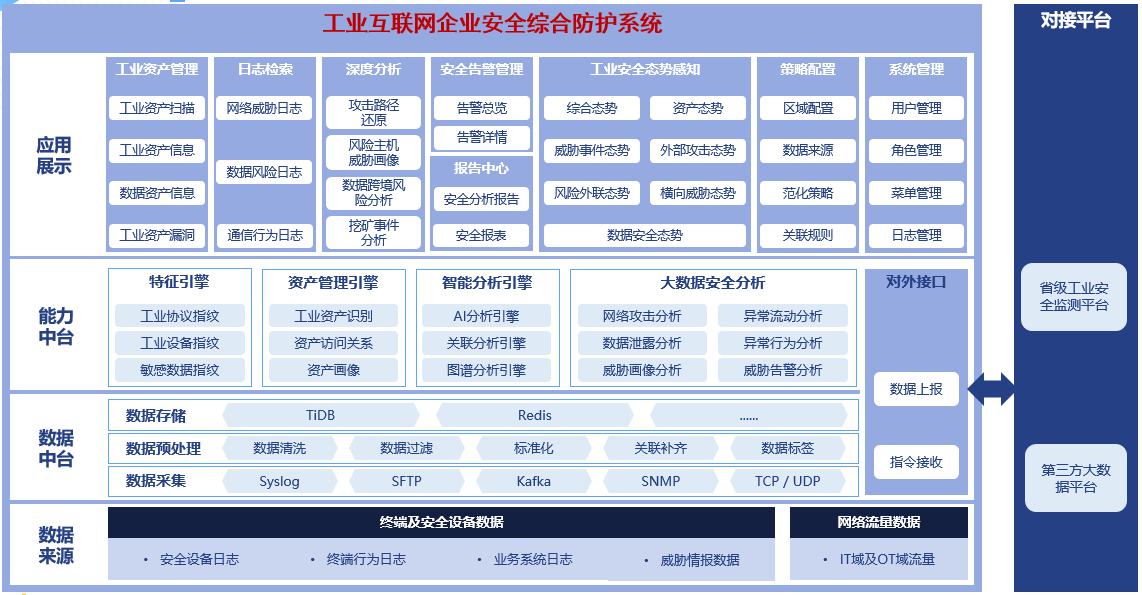 本次方案實(shí)用于工業(yè)企業(yè)的資產(chǎn)整體測(cè)繪、安全監(jiān)測(cè)、威脅識(shí)別及溯源、態(tài)勢(shì)感知呈現(xiàn)及省企對(duì)接服務(wù)。