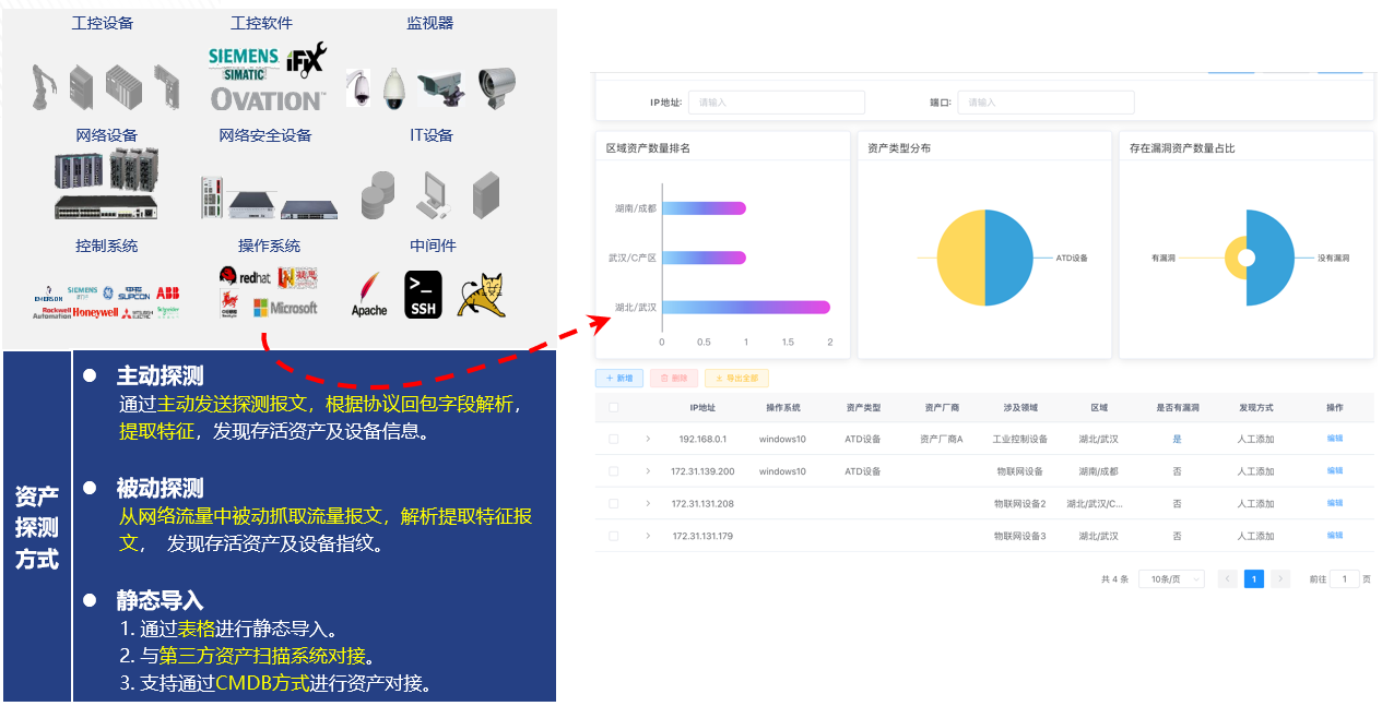 建設(shè)工業(yè)互聯(lián)網(wǎng)完整基礎(chǔ)資產(chǎn)庫(kù):工業(yè)互聯(lián)網(wǎng)資產(chǎn)是其安全監(jiān)測(cè)和預(yù)警的基礎(chǔ)。本方案通過(guò)備案數(shù)據(jù)、主動(dòng)探測(cè)、流量分析、特征識(shí)別等多種機(jī)制,形成覆蓋全國(guó)各省的工業(yè)互聯(lián)網(wǎng)資產(chǎn)庫(kù)。