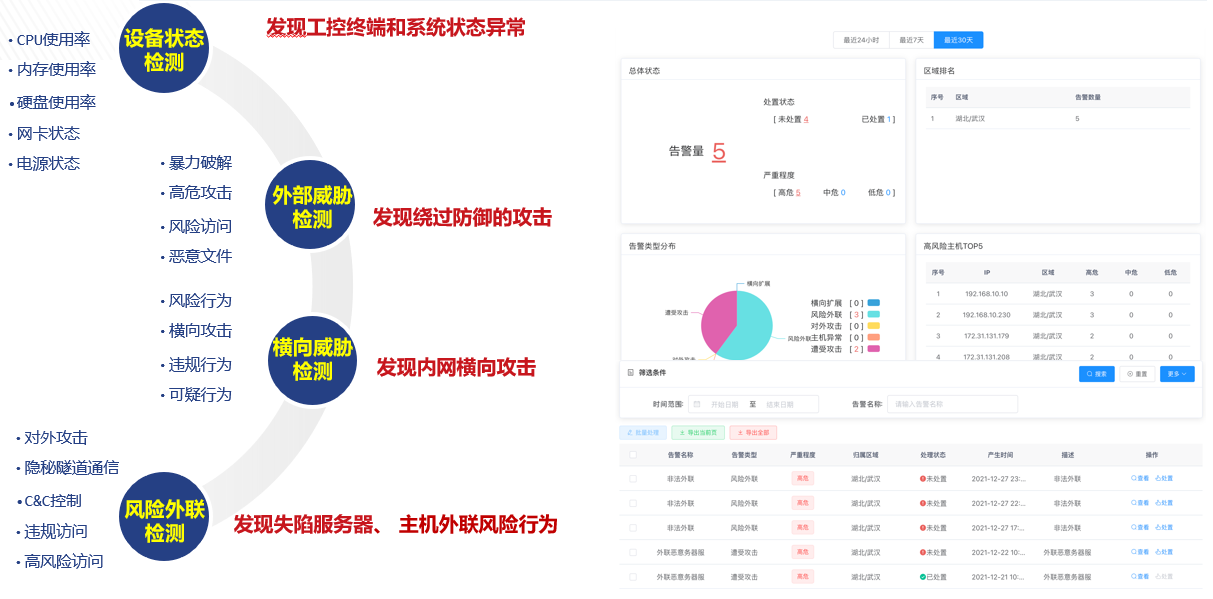 支持安全合規(guī)檢測(cè)、異常攻擊檢測(cè)、非法外聯(lián)檢測(cè)、設(shè)備運(yùn)行狀態(tài)檢測(cè)、內(nèi)網(wǎng)異常訪問(wèn)檢測(cè)、非法程序啟動(dòng)檢測(cè)、APT攻擊檢測(cè)、惡意加密流量檢測(cè)等。