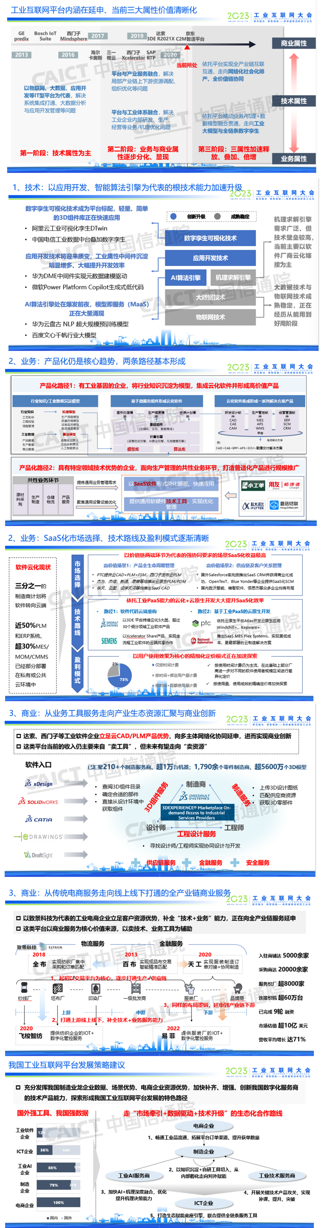 6月15日,2023工業(yè)互聯(lián)網(wǎng)大會(huì)在蘇州舉行,在“工業(yè)互聯(lián)網(wǎng)創(chuàng)新發(fā)展”論壇上,中國(guó)信息通信研究院信息化與工業(yè)化融合研究所工業(yè)互聯(lián)網(wǎng)技術(shù)產(chǎn)業(yè)創(chuàng)新研究部工程師侯羽菲指出,當(dāng)前工業(yè)互聯(lián)網(wǎng)平臺(tái)正在由單一技術(shù)屬性向技術(shù)、業(yè)務(wù)與商業(yè)三大屬性相互疊加演進(jìn)。在技術(shù)層面,數(shù)字孿生可視化、應(yīng)用開發(fā)和人工智能算法引擎三大“根”技術(shù)創(chuàng)新加速;在業(yè)務(wù)層面,產(chǎn)品化與SaaS化是釋放平臺(tái)業(yè)務(wù)賦能價(jià)值的核心;在商業(yè)層面,“工具+資源”服務(wù)為平臺(tái)商業(yè)創(chuàng)新提供新機(jī)遇。