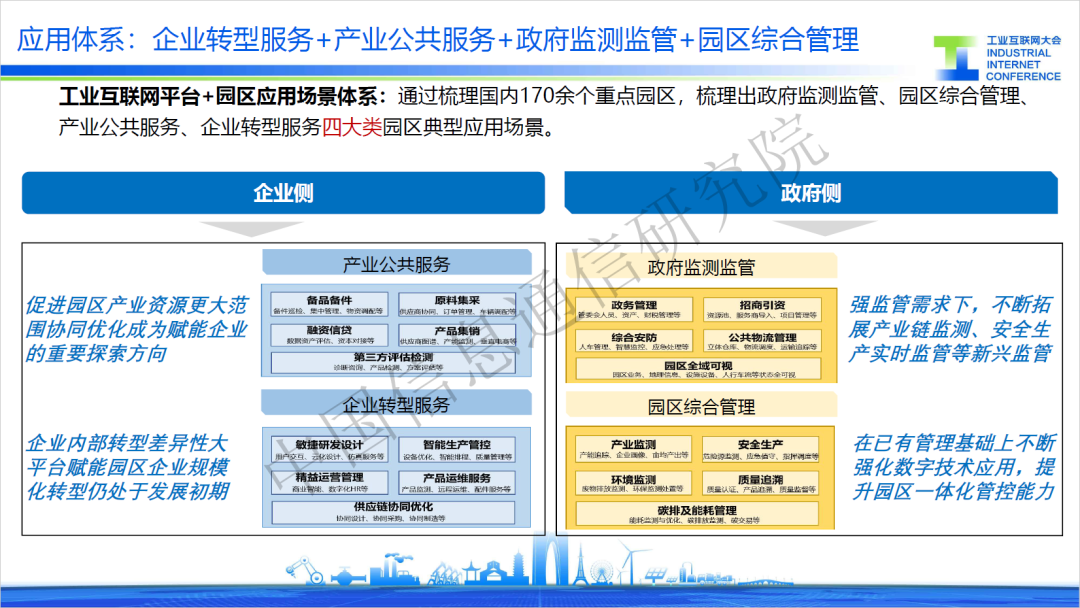 6月15日,2023工業(yè)互聯(lián)網大會在蘇州舉行,在“工業(yè)互聯(lián)網平臺創(chuàng)新發(fā)展”論壇上,中國信通院兩化所工互創(chuàng)新部楊昊亭發(fā)布了《“工業(yè)互聯(lián)網平臺+園區(qū)”典型場景》(以下簡稱“典型場景”)并進行了解讀。園區(qū)作為產業(yè)發(fā)展的主陣地,是推動我國經濟發(fā)展的重要引擎。“典型場景”圍繞園區(qū)高質量發(fā)展需求,提出了產業(yè)公共服務、企業(yè)轉型服務、政府監(jiān)測監(jiān)管、園區(qū)綜合管理四類應用場景,旨在為提升園區(qū)治理能力與加速產業(yè)轉型升級提供可借鑒的經驗和模式。