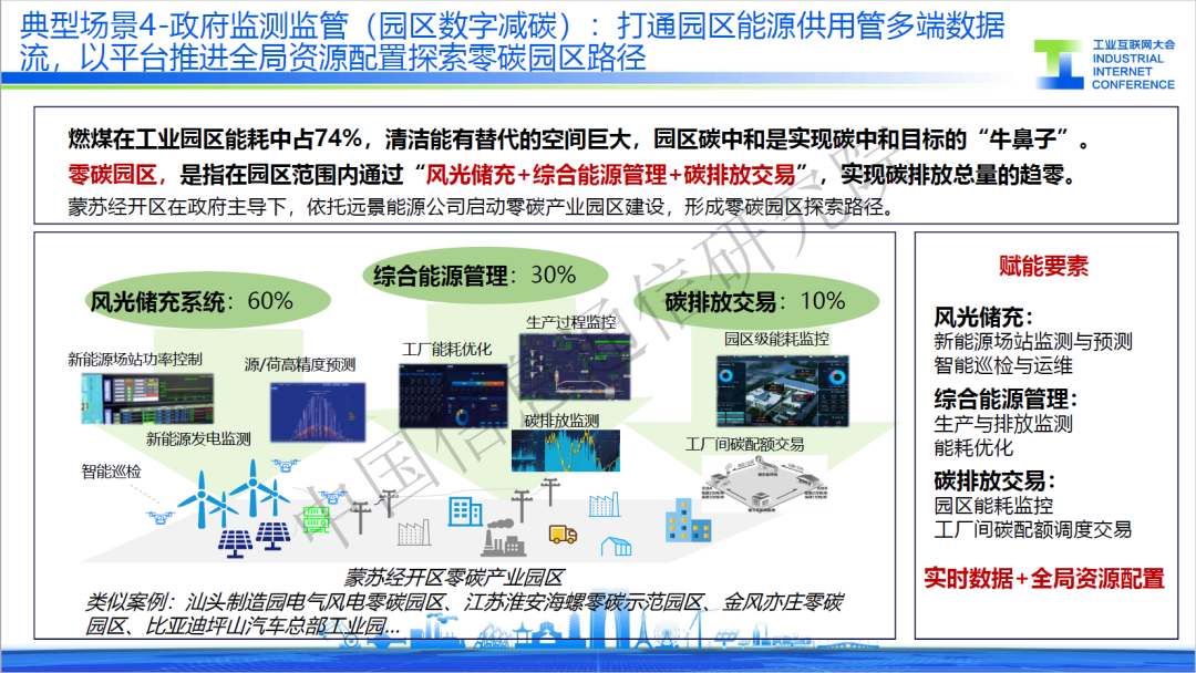 四是園區(qū)數(shù)字減碳,某產業(yè)園區(qū)通過“風光儲充+綜合能源管理+碳排放交易”實現(xiàn)零碳園區(qū)建設。在發(fā)電端,通過數(shù)據(jù)建模優(yōu)化,通過新能源發(fā)電監(jiān)測、源網荷儲調度等方式,優(yōu)化發(fā)電調度的效率;在用電端,通過工廠能耗優(yōu)化、生產過程管控等方式直接減少生產中的碳排放;在監(jiān)管端,提供碳監(jiān)控、碳核驗、碳交易等服務,實現(xiàn)資源的全局配置。