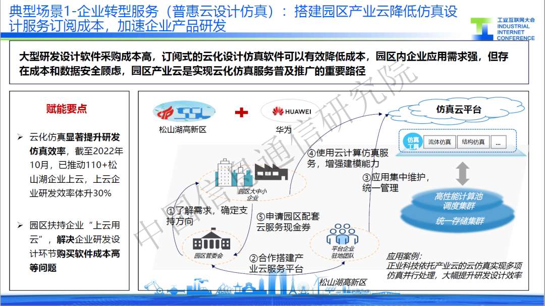 “典型場景”一是普惠云設計仿真,針對中小企業(yè)研發(fā)工具成本高的問題,某服務商通過建立仿真云平臺,一方面提供低成本的仿真工具,并基于平臺實現(xiàn)統(tǒng)一版本管理,降低企業(yè)使用成本。另一方面,打造高性能計算與存儲管理設施,為仿真工具提供算力支撐。目前,該應用已覆蓋110家中小企業(yè),實現(xiàn)研發(fā)效率提升30%。