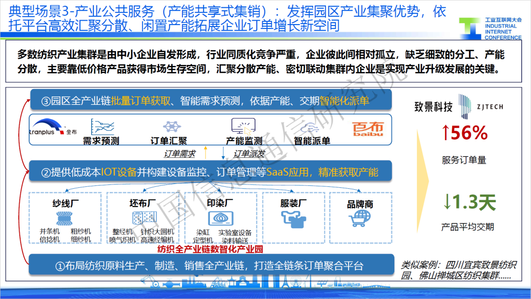 三是產能共享式集銷,紡織企業(yè)同質化競爭嚴重,缺乏細致的分工、產能分散,主要靠低價格產品獲得市場生存空間。某服務商針對紡織企業(yè)痛點打造集采集銷平臺,將訂單需求與企業(yè)生產拉通,通過智能化派單優(yōu)化提高資源配置效率,應用過程中有效提升企業(yè)訂單數(shù)量56%。