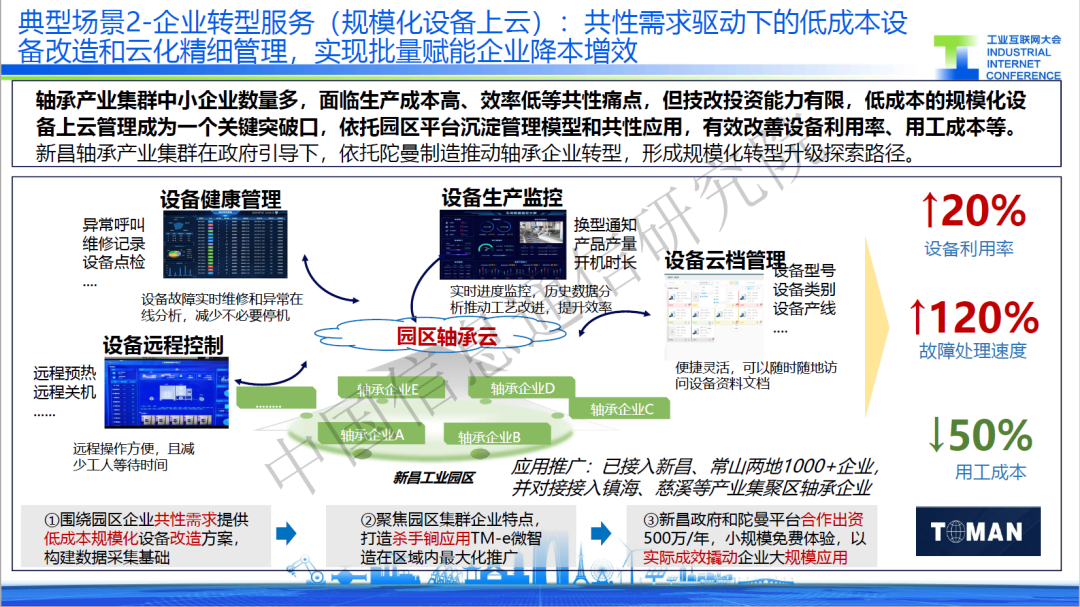 二是規(guī)模化設備上云,針對面向軸承產業(yè)集群中小企業(yè)數(shù)量多,設備停機率高的共性痛點,某服務商打造園區(qū)軸承云,提供設備遠程控制、設備健康管理、設備生產監(jiān)控等一系列殺手锏應用,通過對設備的管控有效減少停機時間,使得軸承行業(yè)綜合成本較改造前下降12%,利潤率也從改造前的4%提升到了8%。