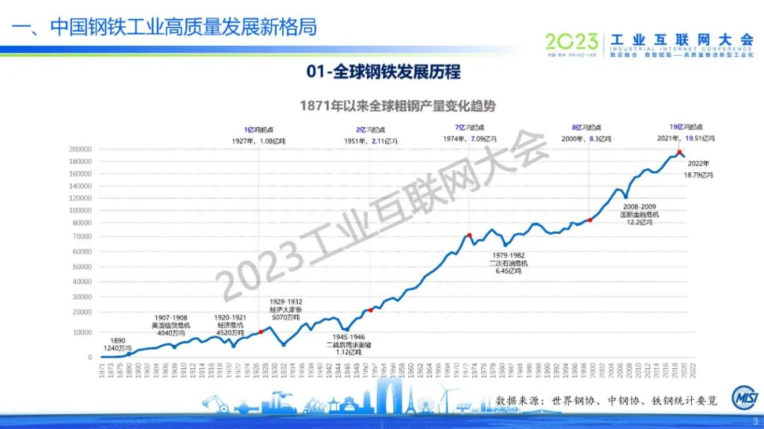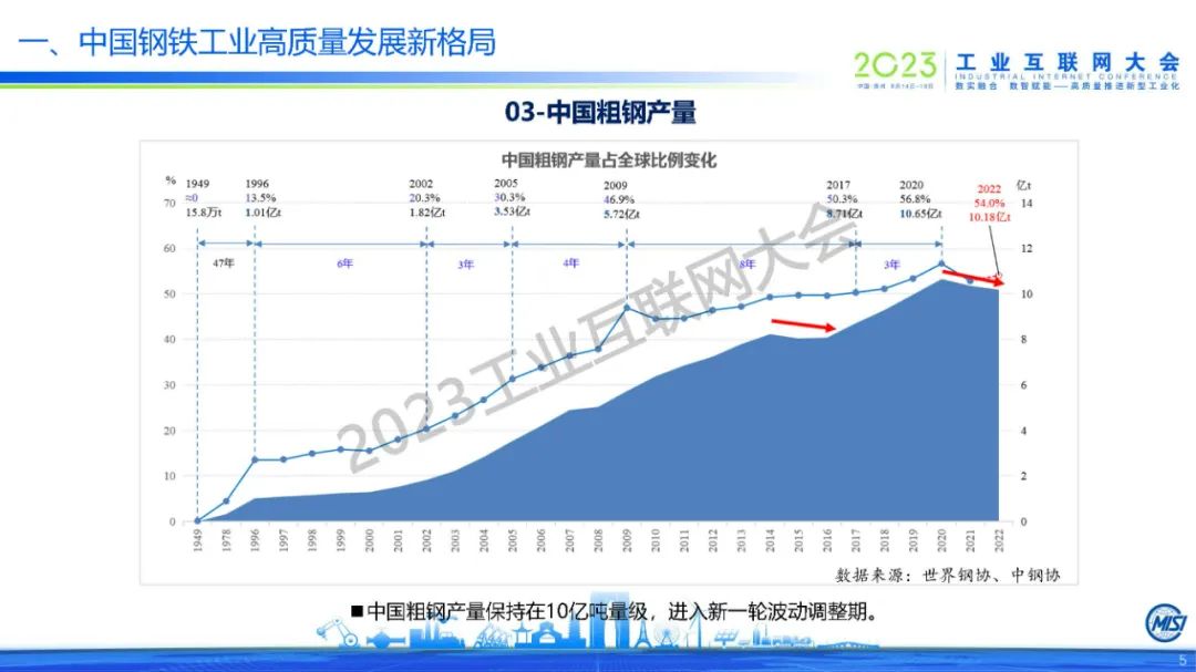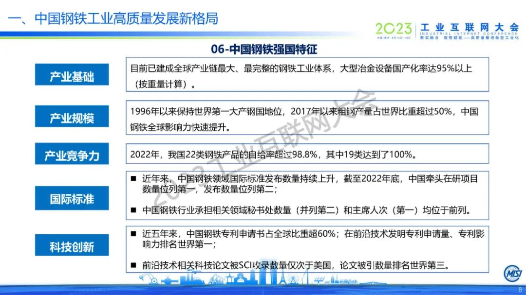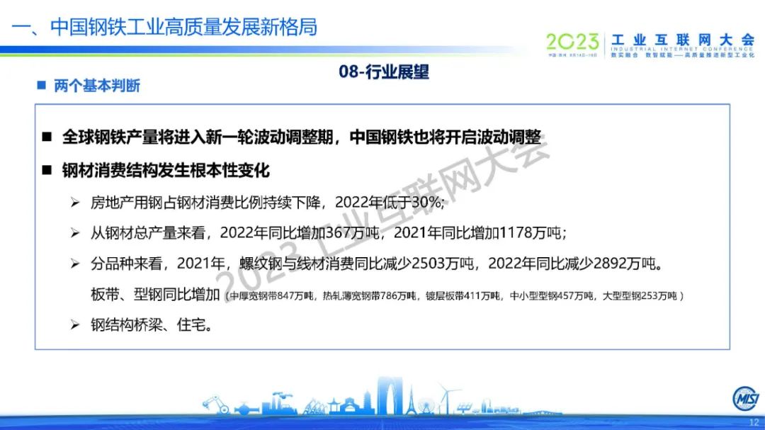 張龍強表示,全球鋼鐵產量將進入新一輪波動調整期,中國鋼鐵也將開啟新的調整。目前中國已經邁入鋼鐵強國的序列,鋼材消費結構發(fā)生根本性變化。他指出數(shù)字化智能化已覆蓋中國鋼鐵、礦山、原料場、煉鐵、煉鋼、軋鋼、能源、廢鋼、物流等全產業(yè)鏈,中國鋼鐵工業(yè)勞動生產率和資源利用效率持續(xù)提升,實現(xiàn)了節(jié)能減排、降本增效,推進了安全生產和勞動環(huán)境改善。