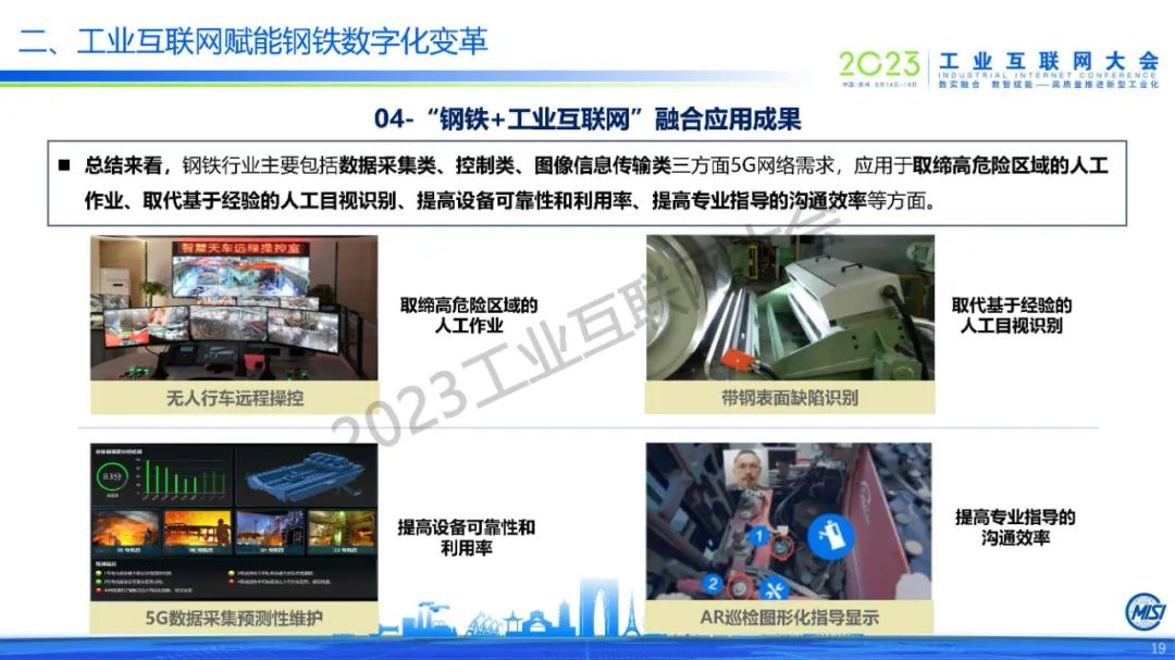 “鋼鐵行業(yè)主要包括數(shù)據(jù)采集類、控制類、圖像信息傳輸類三方面5G網絡需求,應用于取締高危險區(qū)域的人工作業(yè)、取代基于經驗的人工目視識別、提高設備可靠性和利用率、提高專業(yè)指導的溝通效率等方面。”