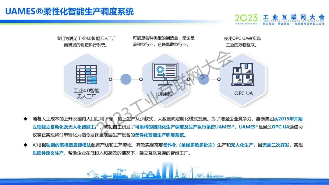 張譽表示隨著人工成本的上升及國內人口紅利的下降,加上工業正在從大批量、單一化的傳統生產模式,轉變為小批量、多樣性的柔性化生產,中國工業從自動化向智能化的轉變已經是大勢所趨。為了增強企業競爭力,嘉泰建立自動化及無人化智能工廠,自主研發了可重構的智能化生產調度及生產執行系統UAMES??筛鶕殑摰谋砀窠7ㄅ渲卯a線和工藝流程,有效實現高度柔性化(單線多款多批次)生產和無人化生產,且無需二次開發,實現以軟件定義生產。幫助企業在低投入和高效的情況下,建立互聯互通的智能工廠。同時,同樣基于信息模型的UAMES與RPAS的協作,也為企業未來大規模數字化打下了堅實的基礎。