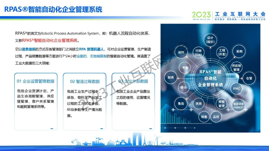 “RPAS是智能自動化企業管理系統,它以信息建模的方式在各個管理環節之間建立RPA機器人,可對企業運營管理、生產制造過程、產品銷售數據等各個方面進行7*24小時全面的、無地域限制的智能自動化監控和管理,同時可以使整個工廠當中再沒有任何的數據孤島?!?/p>