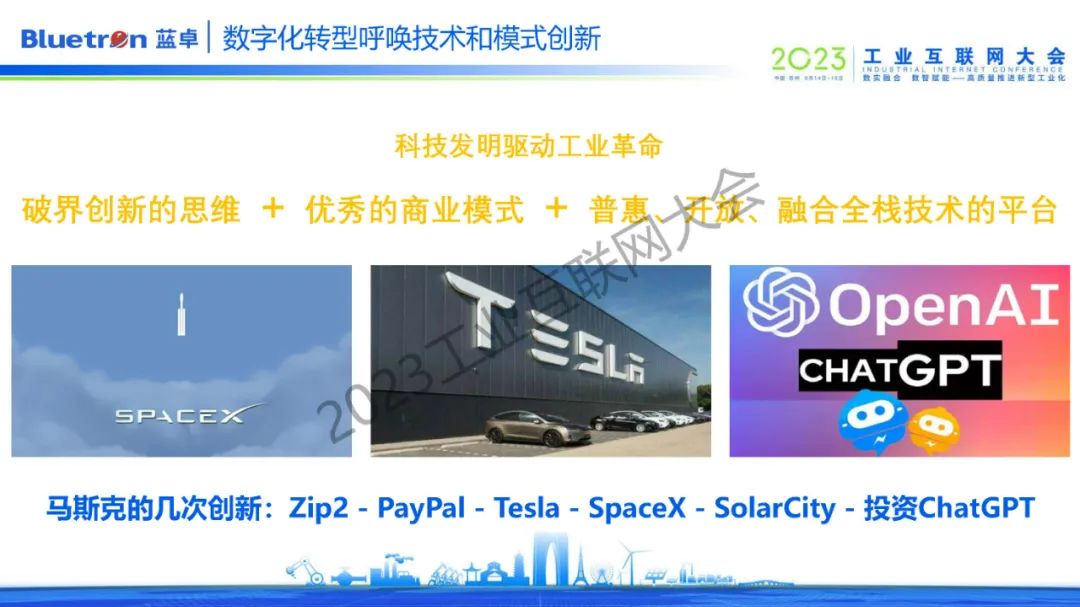 從電氣化到自動(dòng)化到智能化,趙偉總結(jié)了工業(yè)革命的兩個(gè)主要規(guī)律,第一是由科技發(fā)明驅(qū)動(dòng)的工業(yè)革命,比如作為通用技術(shù)的科技發(fā)明推向市場(chǎng)讓更多的場(chǎng)景和客戶(hù)使用。第二是則由創(chuàng)新模式驅(qū)動(dòng)的工業(yè)革命,例如馬斯克的幾次創(chuàng)新,PayPal、特斯拉、SpaceX、以及近期投資ChatGPT等,該模式需要我們擁有破界創(chuàng)新的思維,優(yōu)秀的商業(yè)模式,普惠、開(kāi)放、融合全棧技術(shù)的平臺(tái)。