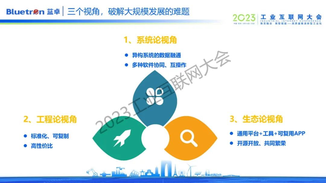 如何破解工業(yè)互聯(lián)網(wǎng)大規(guī)模發(fā)展難題,趙偉從三個(gè)視角出發(fā)提出建設(shè)思路,第一個(gè)是系統(tǒng)論的視角,通過(guò)異構(gòu)系統(tǒng)的數(shù)據(jù)融合,實(shí)現(xiàn)多種軟件協(xié)同易操作的模式。第二個(gè)是工程論的視角,打造標(biāo)準(zhǔn)化、可復(fù)制、高性?xún)r(jià)比的工程實(shí)施模式。第三個(gè)是生態(tài)論的視角,打造通用平臺(tái)+工具+可復(fù)用APP的模式,通過(guò)平臺(tái)逐步開(kāi)源開(kāi)放,共同繁榮應(yīng)用市場(chǎng)。