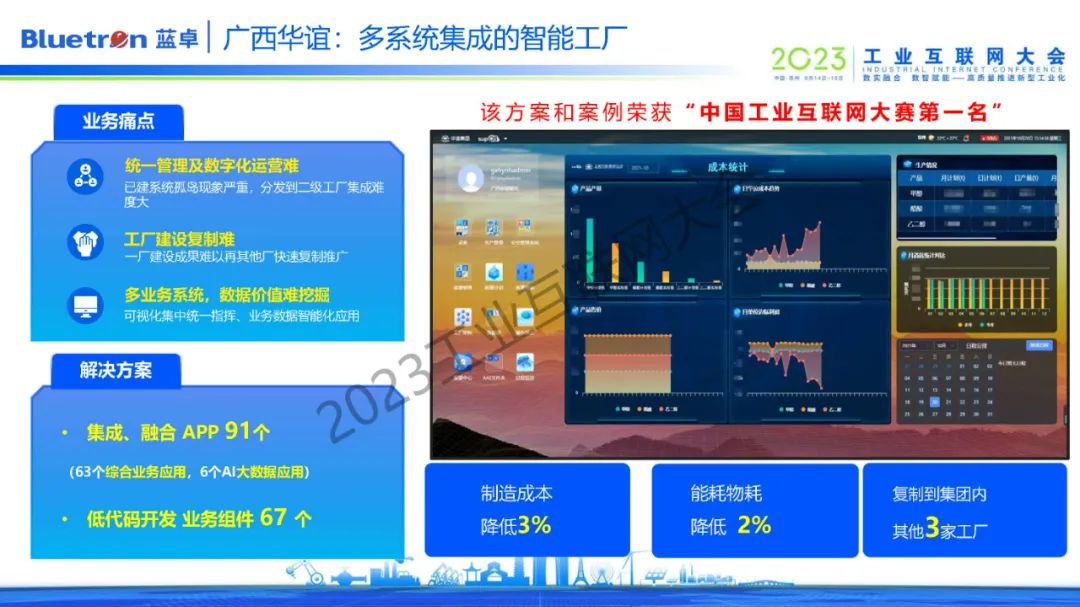 廣西華誼則是典型的多系統(tǒng)集成智能工廠(chǎng),已建系統(tǒng)孤島現(xiàn)象嚴(yán)重,分發(fā)到二級(jí)工廠(chǎng)集成難度大,依托supOS工業(yè)操作系統(tǒng)集成融合了APP91個(gè),便于統(tǒng)一運(yùn)維管理。低代碼開(kāi)發(fā)和業(yè)務(wù)組件67個(gè),滿(mǎn)足個(gè)性化應(yīng)用的需求。通過(guò)數(shù)據(jù)挖掘、協(xié)同優(yōu)化、智能化管理、數(shù)據(jù)化運(yùn)營(yíng),實(shí)現(xiàn)制造成本降低3%,能耗物耗降低2%。該方案也獲得了中國(guó)工業(yè)互聯(lián)網(wǎng)大賽第一名。