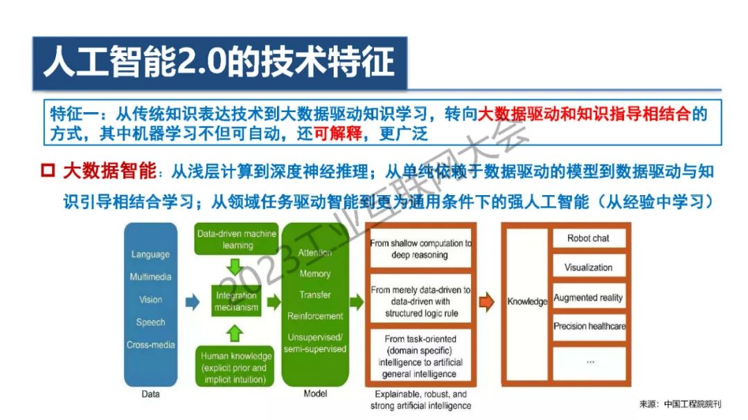 人工智能2.0的技術(shù)特征之一是從傳統(tǒng)知識(shí)表達(dá)技術(shù)到大數(shù)據(jù)驅(qū)動(dòng)知識(shí)學(xué)習(xí),轉(zhuǎn)向大數(shù)據(jù)驅(qū)動(dòng)和知識(shí)指導(dǎo)相結(jié)合的方式,其中機(jī)器學(xué)習(xí)不但可自動(dòng),還可解釋,更廣泛。