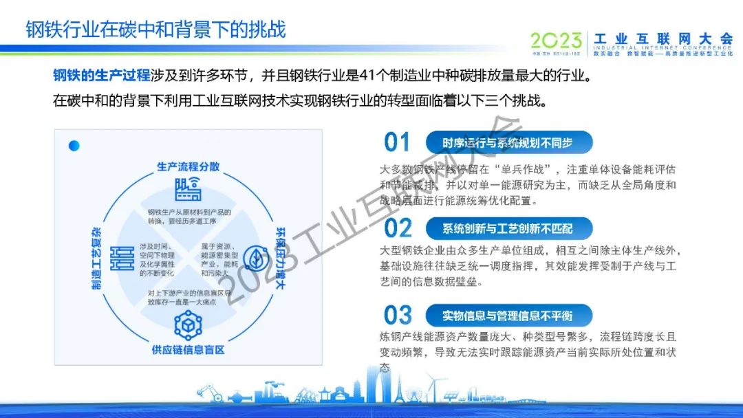 楊冬靚表示鋼鐵的生產(chǎn)過程涉及到許多環(huán)節(jié),并且鋼鐵行業(yè)是41個(gè)制造業(yè)中種碳排放量最大的行業(yè)。在碳中和的背景下利用工業(yè)互聯(lián)網(wǎng)技術(shù)實(shí)現(xiàn)鋼鐵行業(yè)的轉(zhuǎn)型面臨著多重挑戰(zhàn)。并詳細(xì)解釋了通過工序單元模型、碳足跡計(jì)算和平臺(tái)路徑三個(gè)技術(shù)路線來助力鋼鐵行業(yè)實(shí)現(xiàn)低碳轉(zhuǎn)型。
