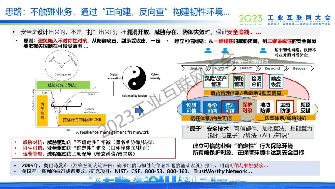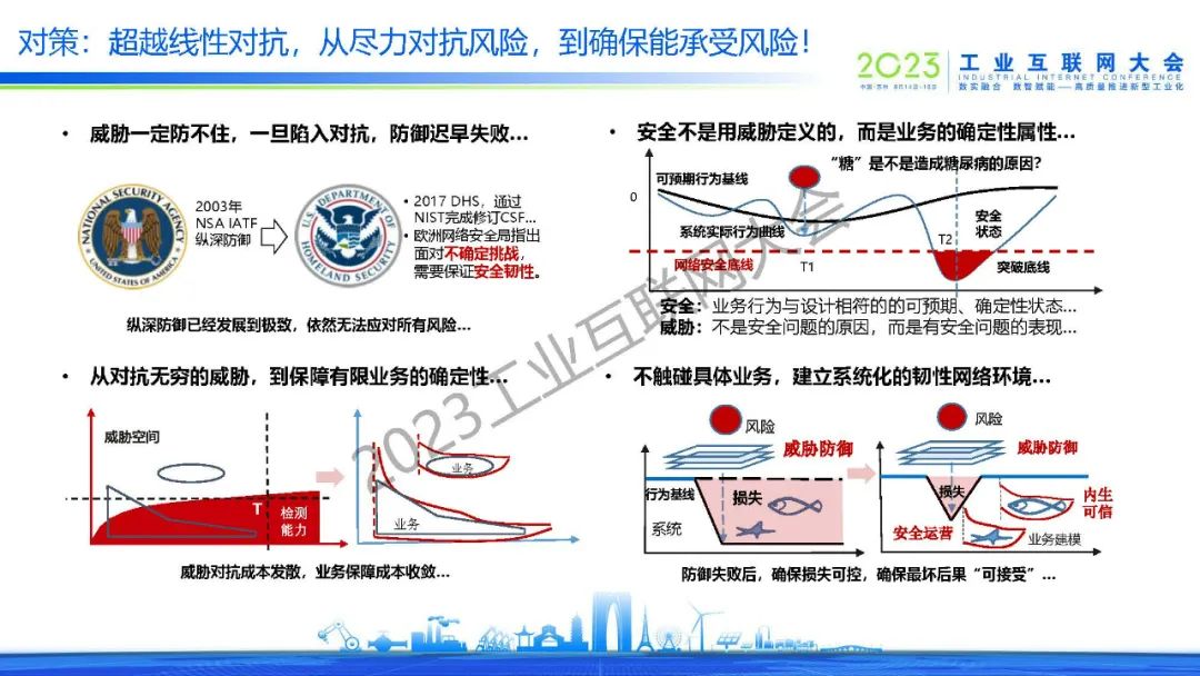 王雨晨指出,安全是產(chǎn)業(yè)數(shù)字化轉(zhuǎn)型中的“馬六甲海峽”,越有價值的系統(tǒng),面臨的安全風(fēng)險越大。對抗策略也需要超越線性對抗,從盡力對抗風(fēng)險,到確保能承受風(fēng)險。建立可信網(wǎng)絡(luò):從一維線性的威脅防御,到三維系統(tǒng)性的安全保障,前置隔離區(qū)爭取最好情況,內(nèi)網(wǎng)微隔離確保最壞結(jié)果可接受,運(yùn)營管理區(qū)實(shí)現(xiàn)動態(tài)安全。