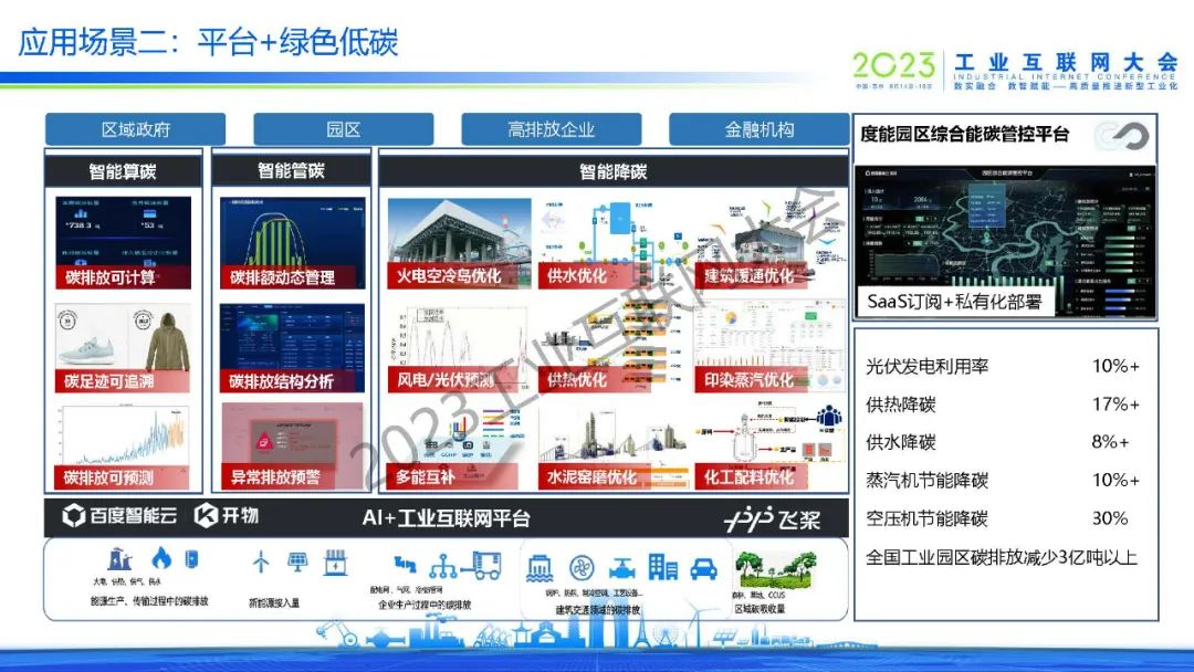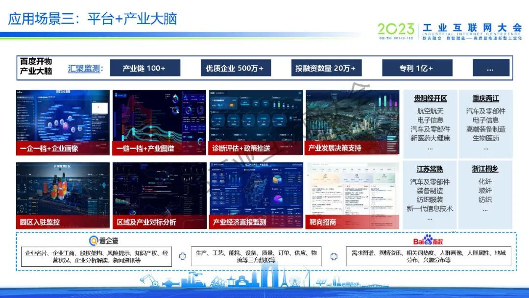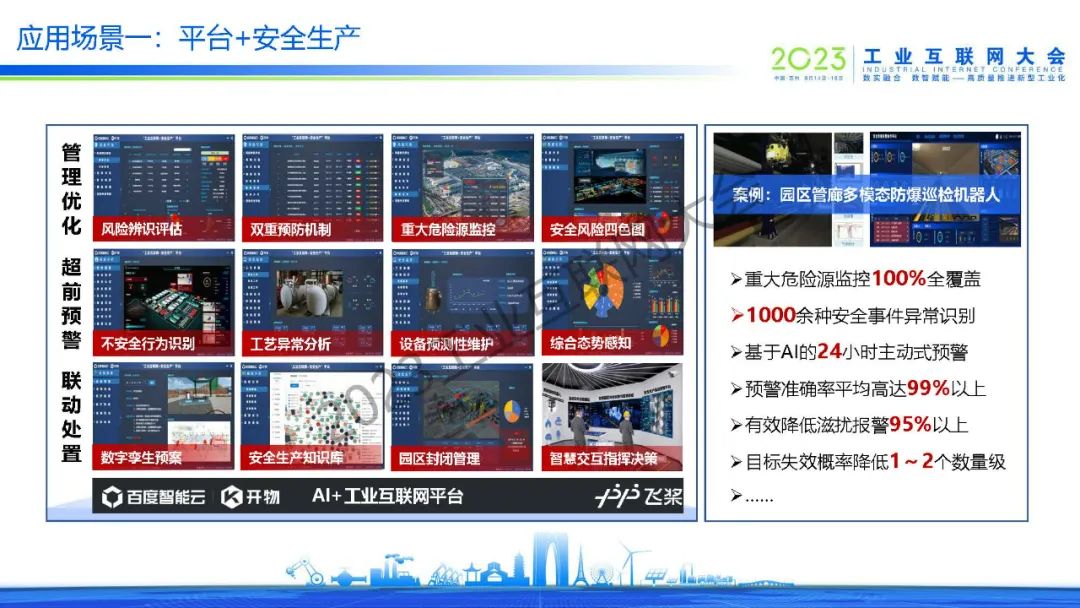 吳學(xué)義指出,百度通過AI+工業(yè)互聯(lián)網(wǎng)助力園區(qū)高質(zhì)量發(fā)展,達(dá)到高產(chǎn)高效,綠色低碳,安全可控,營(yíng)商便捷和活力創(chuàng)新等效果。同時(shí),吳學(xué)義也分享了平臺(tái)+安全生產(chǎn)、平臺(tái)+綠色低碳、平臺(tái)+產(chǎn)業(yè)大腦、平臺(tái)+企業(yè)賦能等多個(gè)應(yīng)用場(chǎng)景。