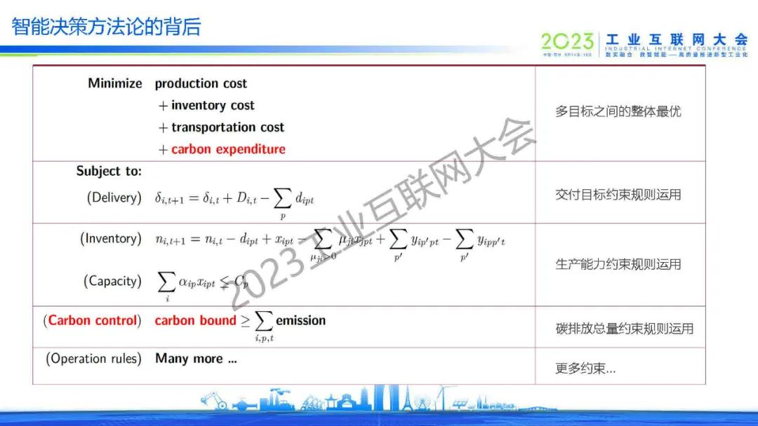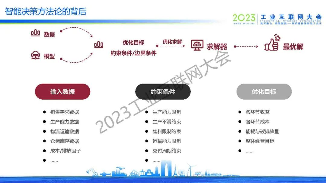 王曦分享了裝備、化工和耐用消費(fèi)品的三個(gè)需求樣例,提出了在服務(wù)工業(yè)數(shù)字化轉(zhuǎn)型升級(jí)中觀察到的四大需求:數(shù)據(jù)驅(qū)動(dòng)、決策導(dǎo)向、尋找最優(yōu)和快速前瞻。智能決策方法論是通過(guò)輸入數(shù)據(jù)和模型,在優(yōu)化目標(biāo)和約束條件(邊界條件)下優(yōu)化求解出最優(yōu)解。