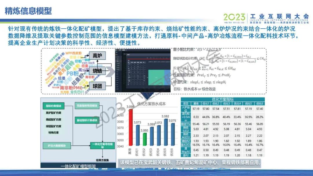 “針對(duì)現(xiàn)有傳統(tǒng)的煉鐵一體化配礦模型,提出了基于庫(kù)存約束、燒結(jié)礦性能約束、高爐爐況約束結(jié)合一體化的爐況數(shù)據(jù)降維及提取關(guān)鍵參數(shù)控制范圍的信息模型建模方法,打通原料-中間產(chǎn)品-高爐冶煉流程一體化配料技術(shù)環(huán)節(jié),提高企業(yè)生產(chǎn)計(jì)劃決策的科學(xué)性、經(jīng)濟(jì)性、便捷性。”