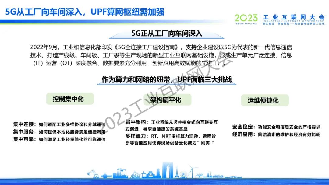 “5G+工業互聯網從輔助生產向融入生產邁進的過程中,UPF作為5G網絡與工業網絡互通的紐帶,需解決控制集中化、架構扁平化、運維便捷化的新需求,從而使能5G與工業互聯網的邊緣算網融合。“