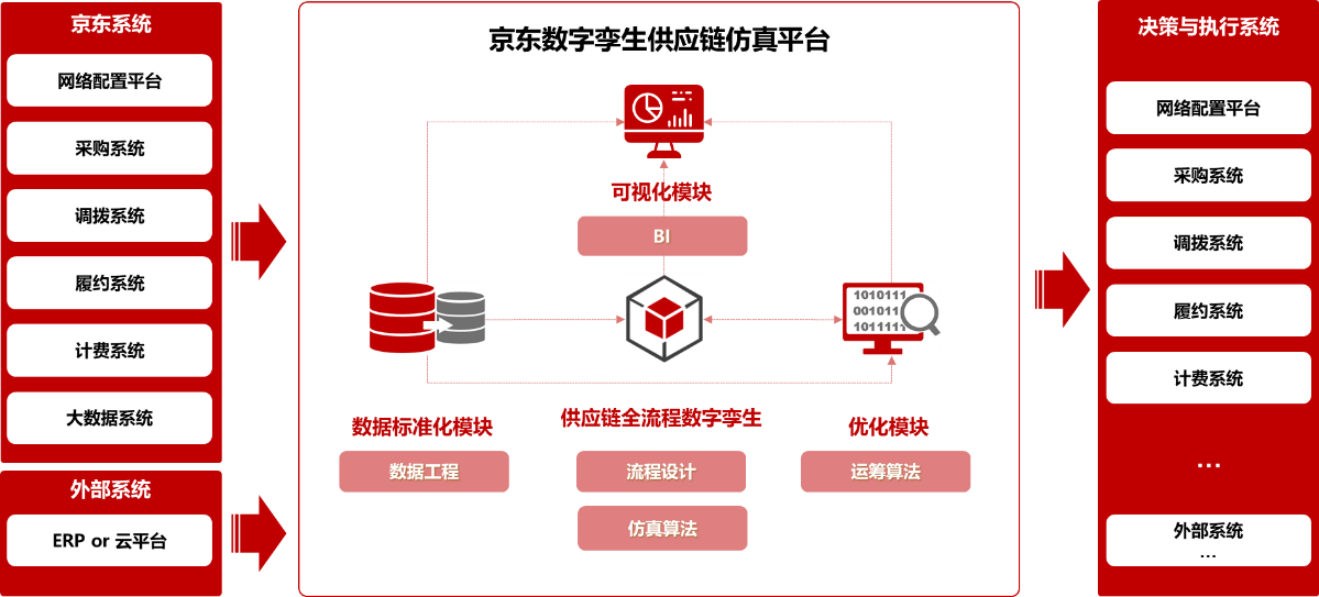 京東數(shù)字孿生供應(yīng)鏈平臺是在業(yè)務(wù)需求下應(yīng)需而生,由于一體化供應(yīng)鏈規(guī)劃覆蓋網(wǎng)絡(luò)及策略的綜合調(diào)整,單一環(huán)節(jié)的仿真技術(shù)無法支持業(yè)務(wù)的綜合規(guī)劃需求。平臺對不同環(huán)節(jié)的仿真算法進(jìn)行集成,基于真實(shí)業(yè)務(wù)數(shù)據(jù),突破式的實(shí)現(xiàn)了長鏈條下的供應(yīng)鏈端到端全流程仿真建模能力,可支持業(yè)務(wù)對過程中的流量流向數(shù)據(jù)及結(jié)果指標(biāo)進(jìn)行多視角分析,使業(yè)務(wù)能夠?qū)Χ喾N假設(shè)進(jìn)行預(yù)研,在決策實(shí)施前就可以提前了解其可能帶來的影響,幫助我們盡可能規(guī)避風(fēng)險,選擇最優(yōu)的策略組合進(jìn)行實(shí)施。