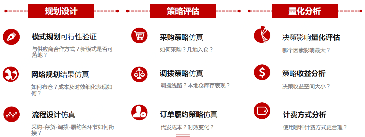 數(shù)字孿生供應(yīng)鏈仿真平臺的核心能力主要分為三大方面,包括針對供應(yīng)鏈的規(guī)劃設(shè)計、不同環(huán)節(jié)的策略評估、以及相應(yīng)的量化分析,三大能力相互連接,由廣泛到精細(xì)。在規(guī)劃設(shè)計方面,主要涉及模式選擇、網(wǎng)絡(luò)規(guī)劃、倉網(wǎng)部署、全流程銜接的仿真等;在策略評估方面,包括各個供應(yīng)鏈環(huán)節(jié)的策略的仿真模擬,用于指導(dǎo)供應(yīng)鏈的計劃與執(zhí)行;在量化分析方面,能夠?qū)Σ煌h(huán)節(jié)的決策因子進(jìn)行分析,衡量策略的收益等。