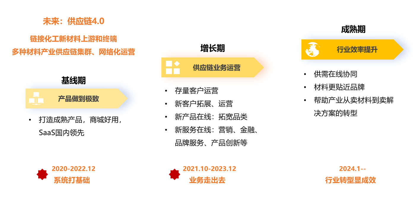 基線期的核心任務(wù)是完成SaaS平臺的打造,以華峰集團旗下各產(chǎn)業(yè)公司的交易場景為試點,完成聚焦在復(fù)雜工業(yè)訂單線上化、工業(yè)支付線上化、物流數(shù)據(jù)在線和開放商城平臺打造,具備產(chǎn)業(yè)內(nèi)和外部客戶推廣的基礎(chǔ)。基線期內(nèi)的主要實施方式和路徑為:首先確定試點產(chǎn)業(yè),平臺從2018年開始選擇華峰超纖作為首批上線試點產(chǎn)業(yè)公司,搭建了下單+票據(jù)支付模塊,完成訂單基礎(chǔ)功能搭建;至2020年全面升級2.0版本,該版本支持華峰新材料、華峰氨綸上線,進一步完善了自主下單+邀約下單的模式以及完成票據(jù)、電匯、轉(zhuǎn)賬等全場景支付工具功能部署;2021年進入從內(nèi)部平臺到商城開放,產(chǎn)業(yè)上線擴大到8個大品類,同時拓展下游客戶作為賣家上線,對外提供SaaS服務(wù)。