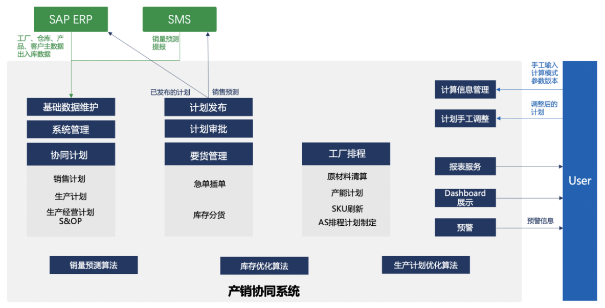 通過搭建一套產銷協同系統,與六國現有SAP ERP及SMS對接,引入AI預測算法及運籌優化算法,優化需求計劃、優化補貨及庫存策略、優化生產計劃、實現產銷協同模擬,以應對產品需求多樣性的市場,實現提升產銷協同能力、提高市場響應速度、提高投入產出比、提升精細化管理能力。