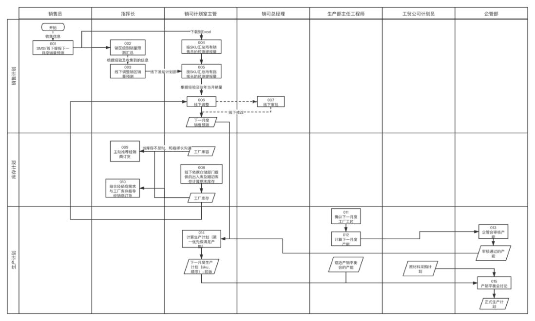 005 | 按SKU匯總所有指揮長的預測提報量 | 銷司計劃室主管 | 計劃室主管收集所有指揮長到sku、銷區的銷量預測計劃,統計到上一過程(004)Excel中,并匯總到sku | 指揮長到sku、銷區的銷量預測計劃 |