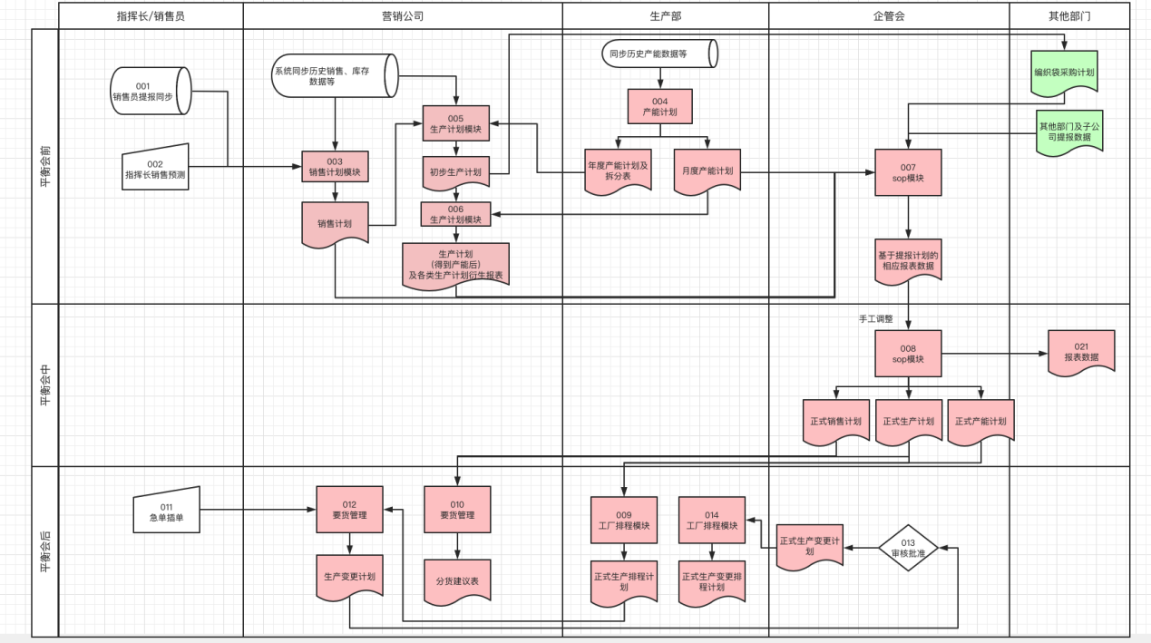 008 | 平衡會 | 企管會 | 根據企管會在sop模塊上進行的指標計算進行討論決定正式計劃 | 月度產能計劃; 生產計劃; 銷售計劃; 采購計劃; 其他部門提報數據; 各類報表數據 | 正式月度產能計劃; 正式生產計劃; 正式銷售計劃; 正式采購計劃; 各類報表數據 |