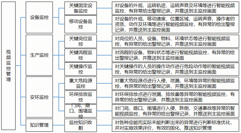 對現場指定位置進行智能視頻監控,有異常彈出畫面警報提醒,確?,F場異常的及時發現。它通過對生產現場關鍵設備、移動設備,關鍵的崗位、流程和操作,重大的危險源、環保排放、門崗、路口和圍墻進行視頻監控,對異常情況進行智能判斷、報警記錄,同時推送到主監控畫面,并進行知識收割,實現與HSE、生產、設備、能源、物流和知識管理的協同。