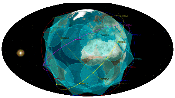 空間段:主要是由38顆DCS衛(wèi)星,構(gòu)成天啟衛(wèi)星星座,以及DCS載荷系統(tǒng)組成,實(shí)現(xiàn)全球覆蓋;通過部署在六個(gè)軌道平面上的38顆衛(wèi)星,由通信鏈路將多個(gè)軌道平面上的衛(wèi)星聯(lián)結(jié)起來形成,形成星座組網(wǎng);為地面用戶提供覆蓋全球的天基物聯(lián)網(wǎng)通信服務(wù)。