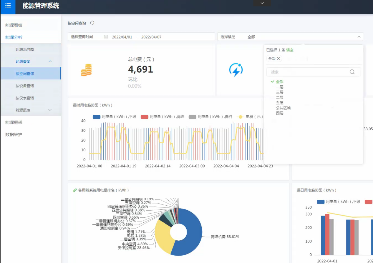 運營分析能源管理。園區(qū)在能源管理方面具有很大的需求,能源管理能力的不足,會導(dǎo)致大量能源的浪費,園區(qū)應(yīng)對公共區(qū)域內(nèi)的用能進行監(jiān)測,包括用水管理、用電管理、用氣管理。因此,本項目中通過建設(shè)全方位的能源管理系統(tǒng)對園區(qū)的能耗進行實時采集以及能耗分析,基于人工智能在能耗分析方面的應(yīng)用,橫向?qū)Ρ韧愋蛨@區(qū)用能情況、縱向?qū)Ρ让咳铡⒃碌挠媚芮闆r,加強園區(qū)能耗精細化管理,發(fā)現(xiàn)園區(qū)潛在能耗大戶。