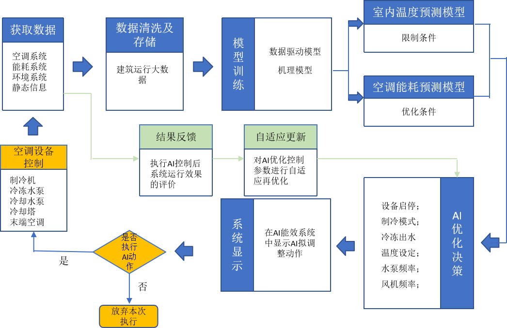 AI優(yōu)化算法通過能源中心獲取空調(diào)系統(tǒng)運行數(shù)據(jù)、能耗數(shù)據(jù)以及建筑環(huán)境數(shù)據(jù),通過對數(shù)據(jù)清洗、整理及存儲,以數(shù)據(jù)驅(qū)動和系統(tǒng)機理搭建AI優(yōu)化算法模型,包括溫度預(yù)測模型和能耗預(yù)測模型,并對空調(diào)系統(tǒng)關(guān)鍵運行參數(shù)進行最優(yōu)決策,包括主機臺數(shù)、出水溫度、水泵頻率、新風(fēng)機組的風(fēng)機頻率、風(fēng)閥開度、水閥開度等,算法將控制指令下發(fā)給平臺,實現(xiàn)設(shè)備參數(shù)的自動調(diào)節(jié)。
