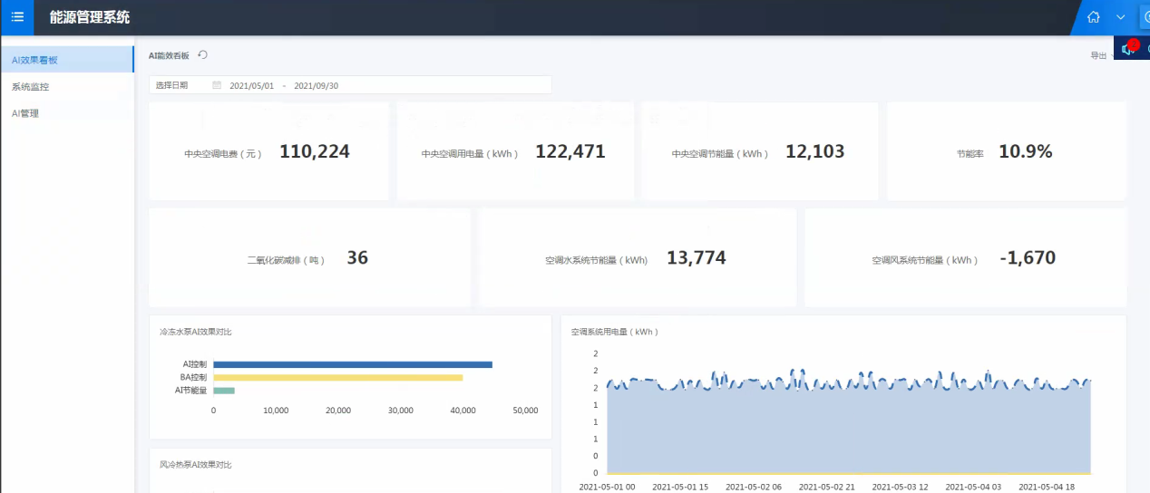 在穩(wěn)定運行的基礎(chǔ)上,通過AI能效系統(tǒng)使設(shè)備高效運行。根據(jù)實時采集的環(huán)境及設(shè)備數(shù)據(jù)對系統(tǒng)進行實時調(diào)優(yōu),利用數(shù)學(xué)模型,優(yōu)化控制中央空調(diào)系統(tǒng)的運行模式,提高系統(tǒng)運行效率,延長設(shè)備壽命,降低系統(tǒng)維修成本。