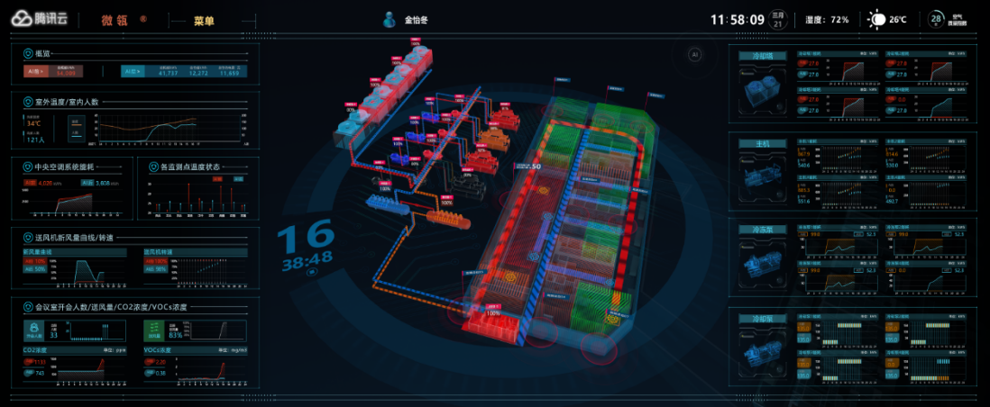 能源中心將利用AI、大數(shù)據(jù)、物聯(lián)網(wǎng)、數(shù)字BIM技術(shù),打造安全、便捷、節(jié)能的能源綜合利用園區(qū),實現(xiàn)園區(qū)整體能源的“可視、可控、可管”。通過整合園區(qū)內(nèi)多種能源系統(tǒng),如冷熱源、光伏、風(fēng)機、充電樁、儲能以及其他終端負荷,打造多能互補能源網(wǎng)絡(luò)。實現(xiàn)就地生產(chǎn)、就地消納的供應(yīng)形式,集中式和分布式相協(xié)調(diào)互補,在微網(wǎng)內(nèi)實現(xiàn)能源自發(fā)自用,甚至余電上網(wǎng),實現(xiàn)綜合能源轉(zhuǎn)換效率的提升,清潔能源占比的提升,大幅減少園區(qū)碳排放。