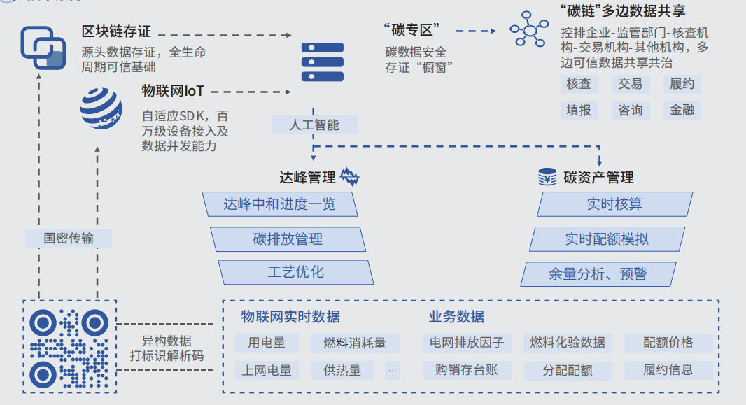 在區(qū)域碳達(dá)峰碳中和目標(biāo)下,企業(yè)碳資產(chǎn)管理水平,快速實(shí)現(xiàn)低碳轉(zhuǎn)型顯得尤為重要。針對工業(yè)企業(yè),實(shí)現(xiàn)基于區(qū)塊鏈為底層核心技術(shù)支撐,對碳排放及碳交易相關(guān)過程中的物聯(lián)網(wǎng)監(jiān)測數(shù)據(jù)、文檔文件數(shù)據(jù)、業(yè)務(wù)系統(tǒng)數(shù)據(jù)進(jìn)行上鏈,確保數(shù)據(jù)真實(shí)可信、不可篡改,基于區(qū)塊鏈智能合約聯(lián)通重點(diǎn)溫室氣體排放單位、自愿減排業(yè)主單位、政府部門、金融機(jī)構(gòu)、交易機(jī)構(gòu)等,將雙碳數(shù)據(jù)實(shí)時上鏈,以便管理機(jī)構(gòu)進(jìn)行監(jiān)測和核算,為碳排放交易及相關(guān)業(yè)務(wù)過程中的數(shù)據(jù)交互提供保障,實(shí)現(xiàn)數(shù)據(jù)資產(chǎn)至碳資產(chǎn)的轉(zhuǎn)化,助力工業(yè)企業(yè)在持續(xù)健康生產(chǎn)加工的過程中也能順利實(shí)現(xiàn)雙碳目標(biāo)的達(dá)成。