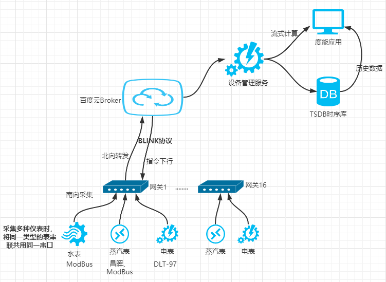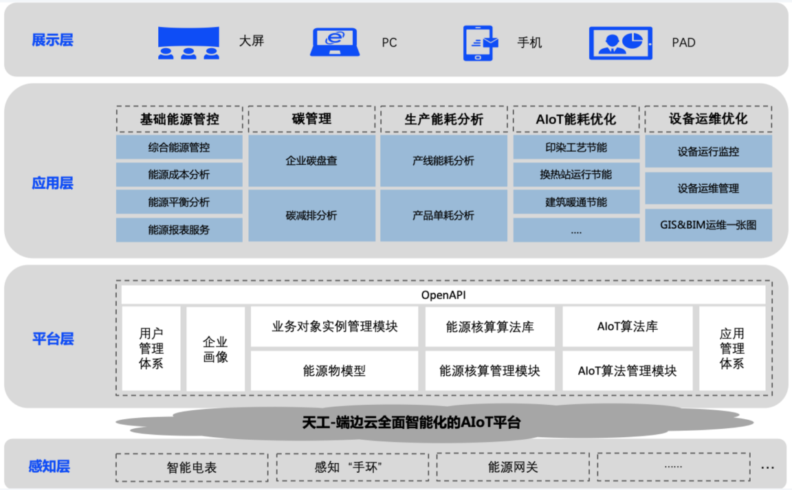 平臺層:百度天工AIoT平臺層主要提供安全穩定的IoT數據接入、及時有效的數據處理及聚合計算,它具有高可靠數據庫服務,豐富的平臺數據接口支持,是保障能源管理服務的技術基石。AIoT接入服務為設備提供安全可靠的連接通信能力,向下連接海量設備,支撐設備數據采集上云;向上提供云端API,指令數據通過API調用下發至設備端,實現遠程控制。